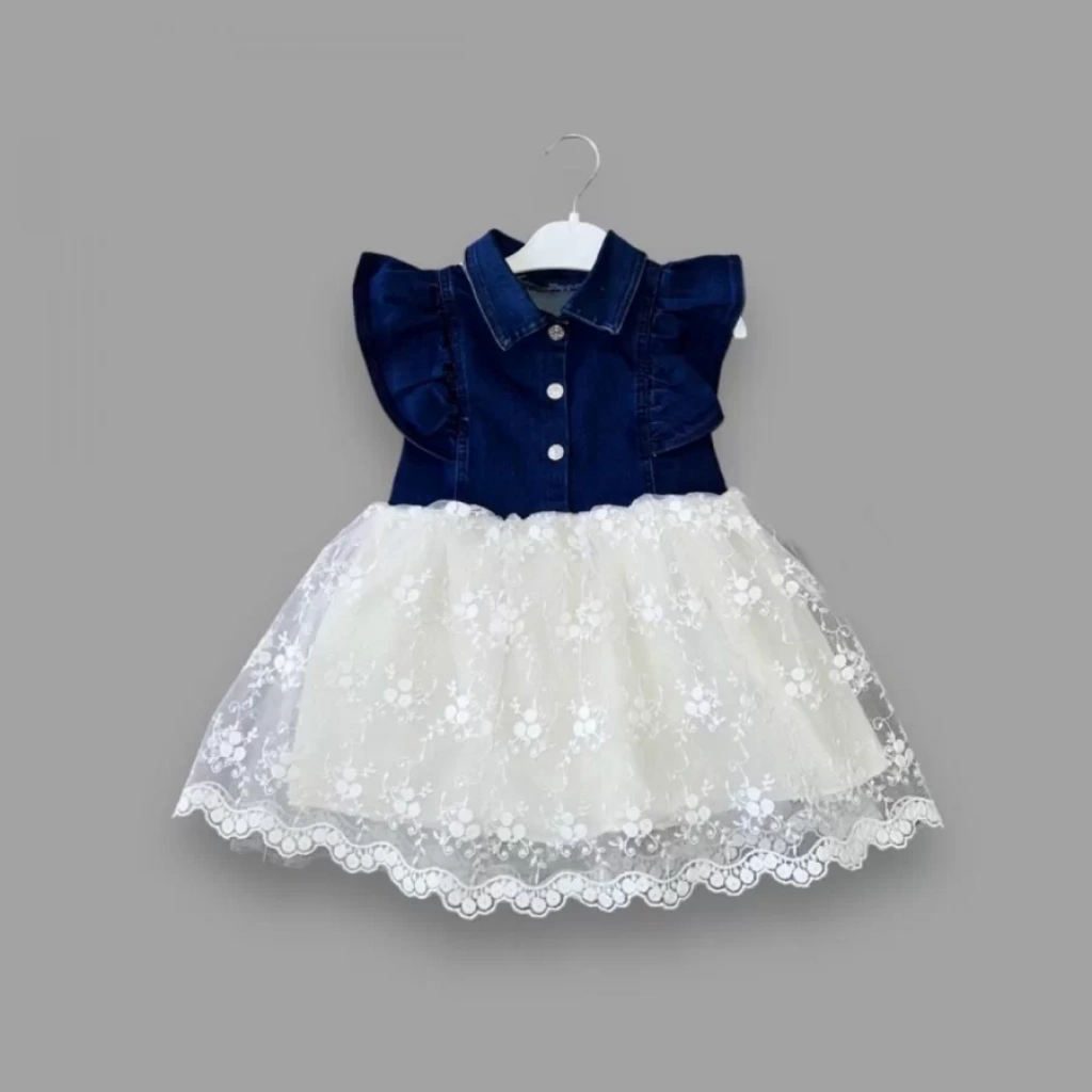 • 2-3-4 Yaş Astarlı Brode Etekli Kot Kumaş Düğmeli Kız Çocuk Elbisesi