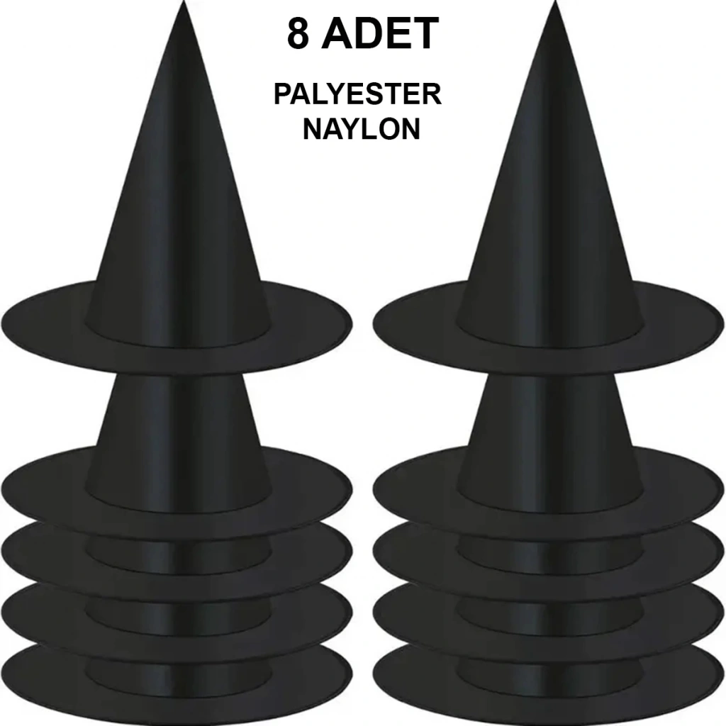 8 Adet Siyah Cadı Şapkası – Yetişkin & Çocuk Kostüm Aksesuarı