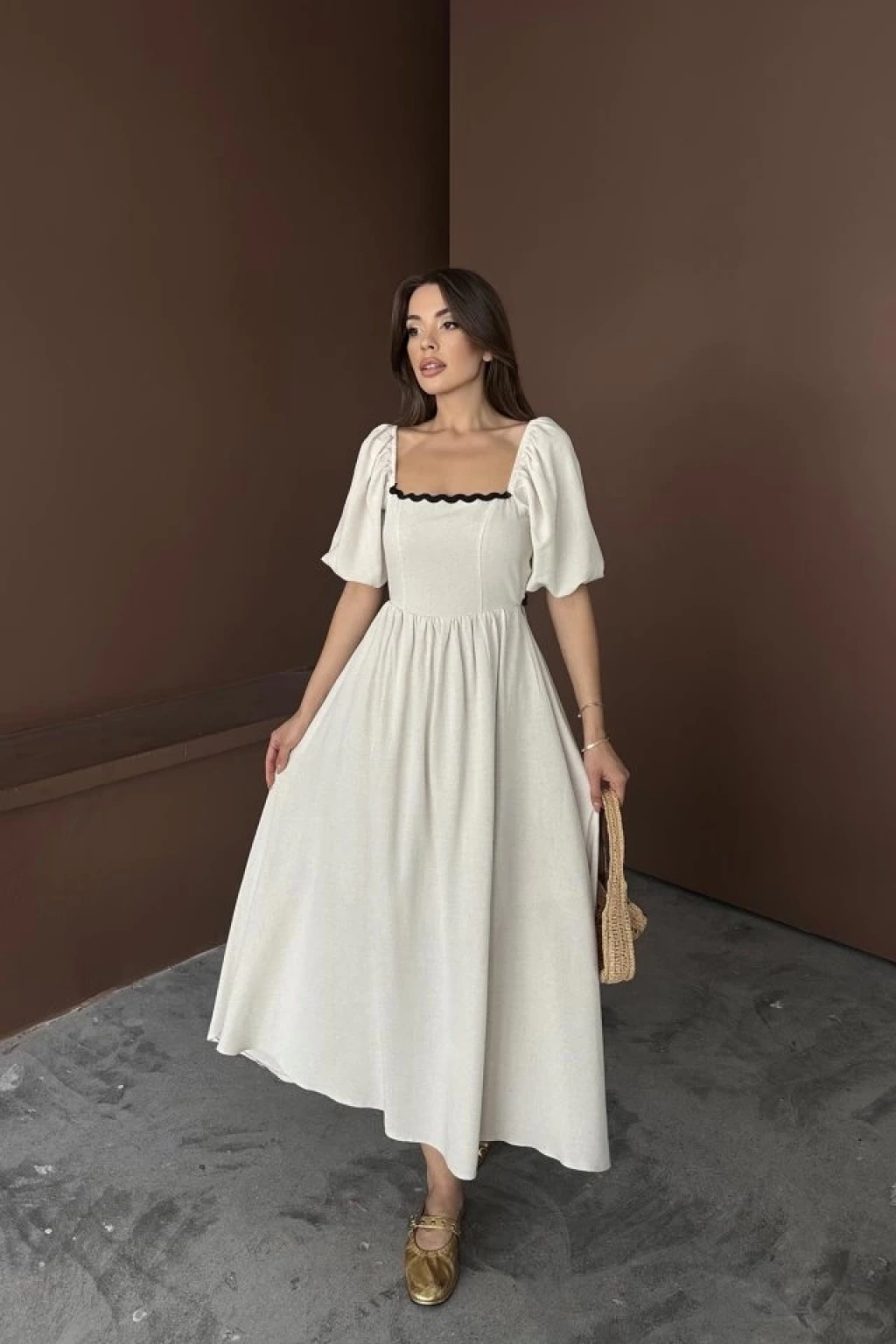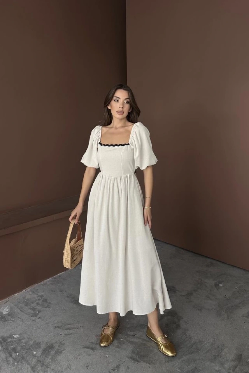 Bej Arkası Bağlamalı Keten Elbise