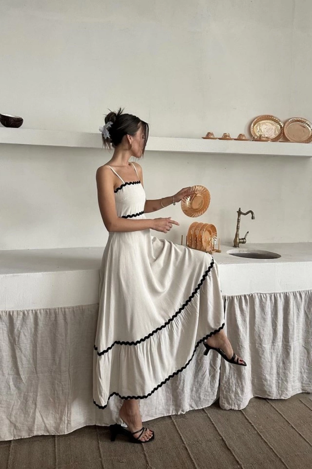 Bej Şerit Detay Keten Elbise
