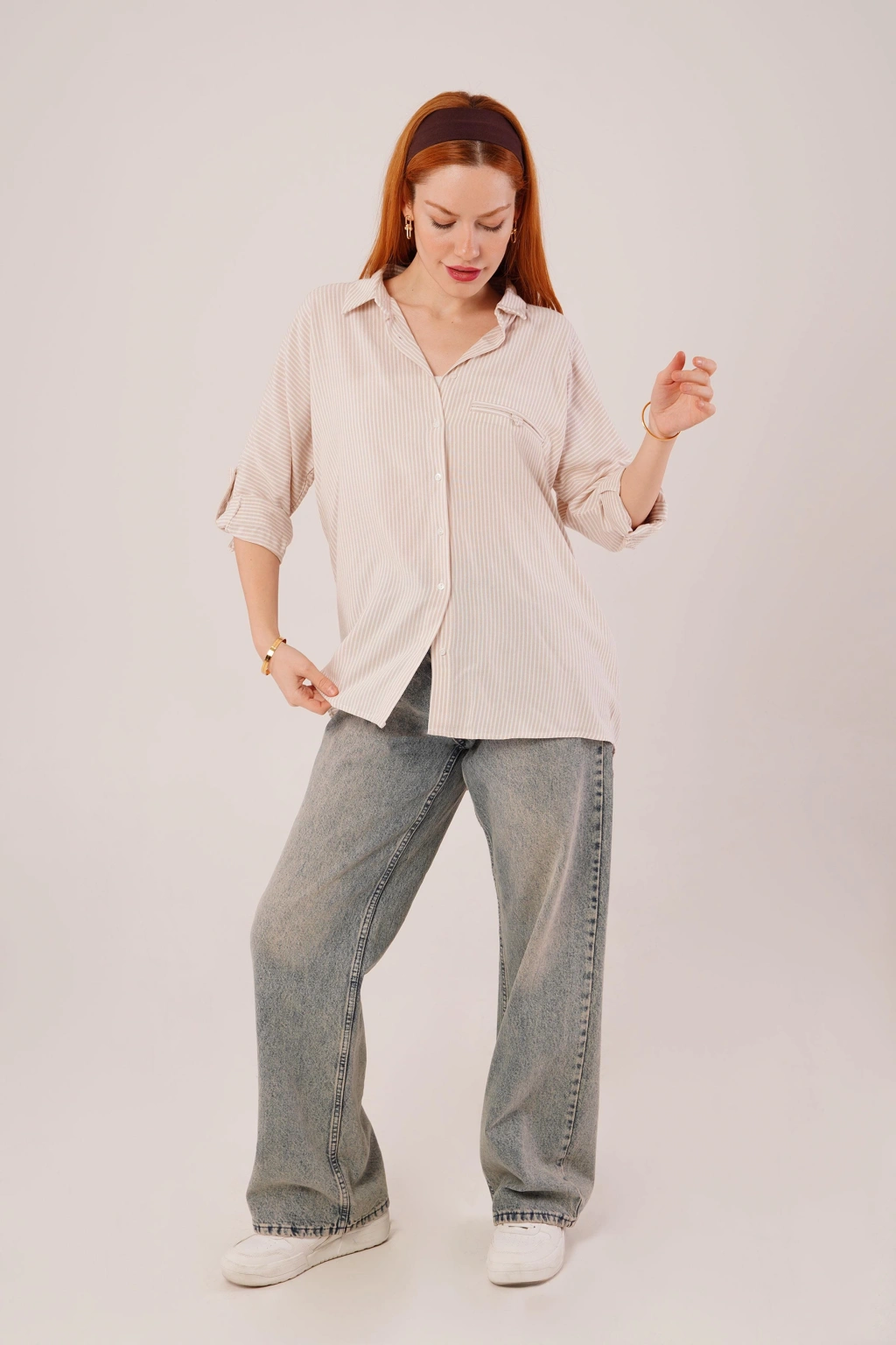 Cep Detay Çizgili Oversize Krem Gömlek