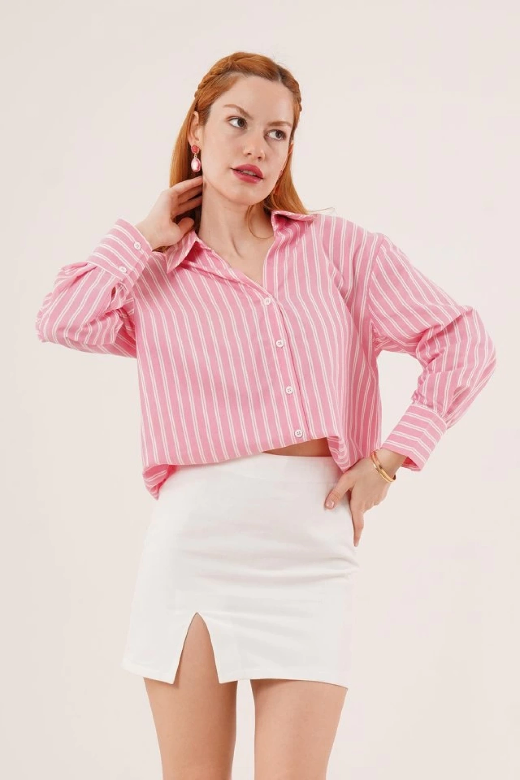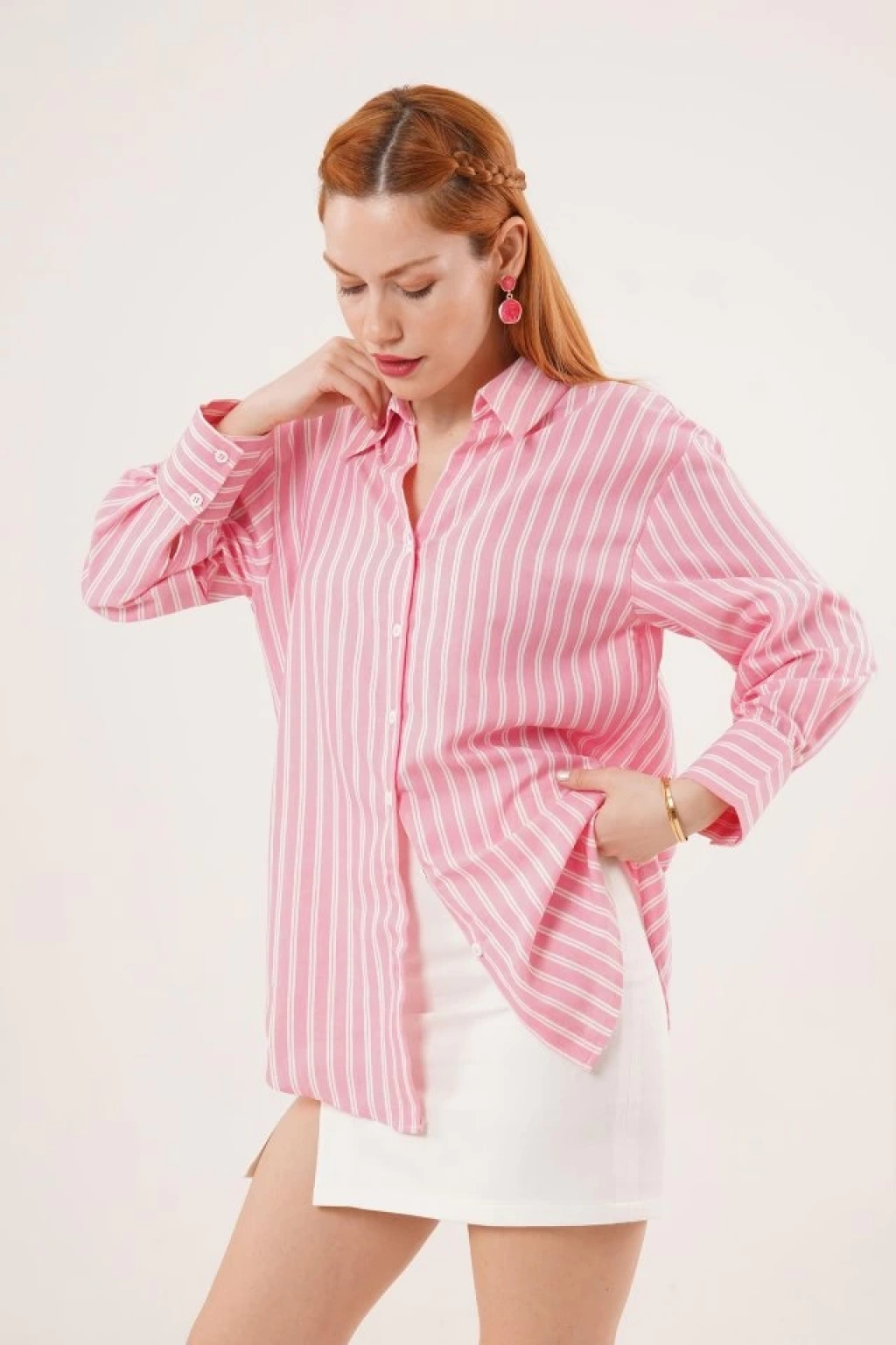 Çift Çizgi Geçişli Düğmeli Pembe Gömlek