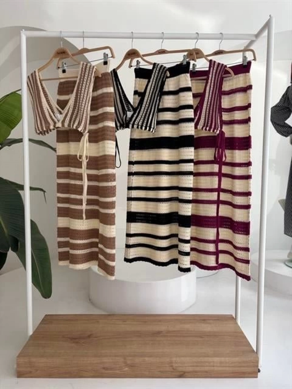 Çizgili Bikini Üst Ve Etek Triko Takım 10110