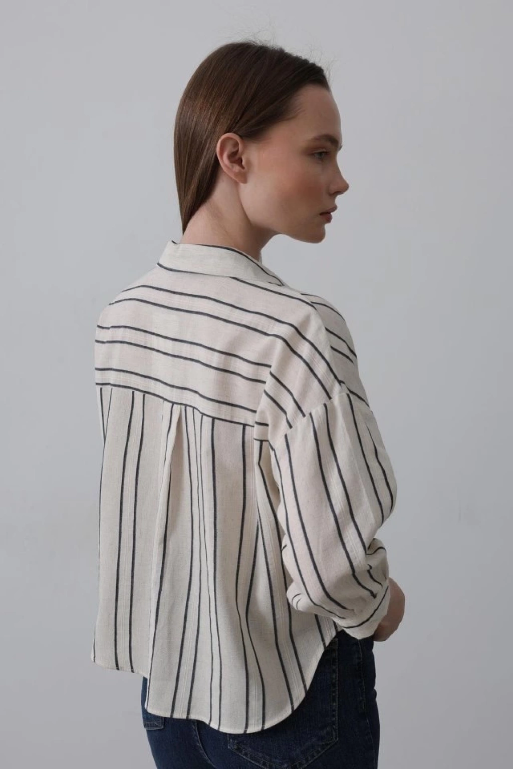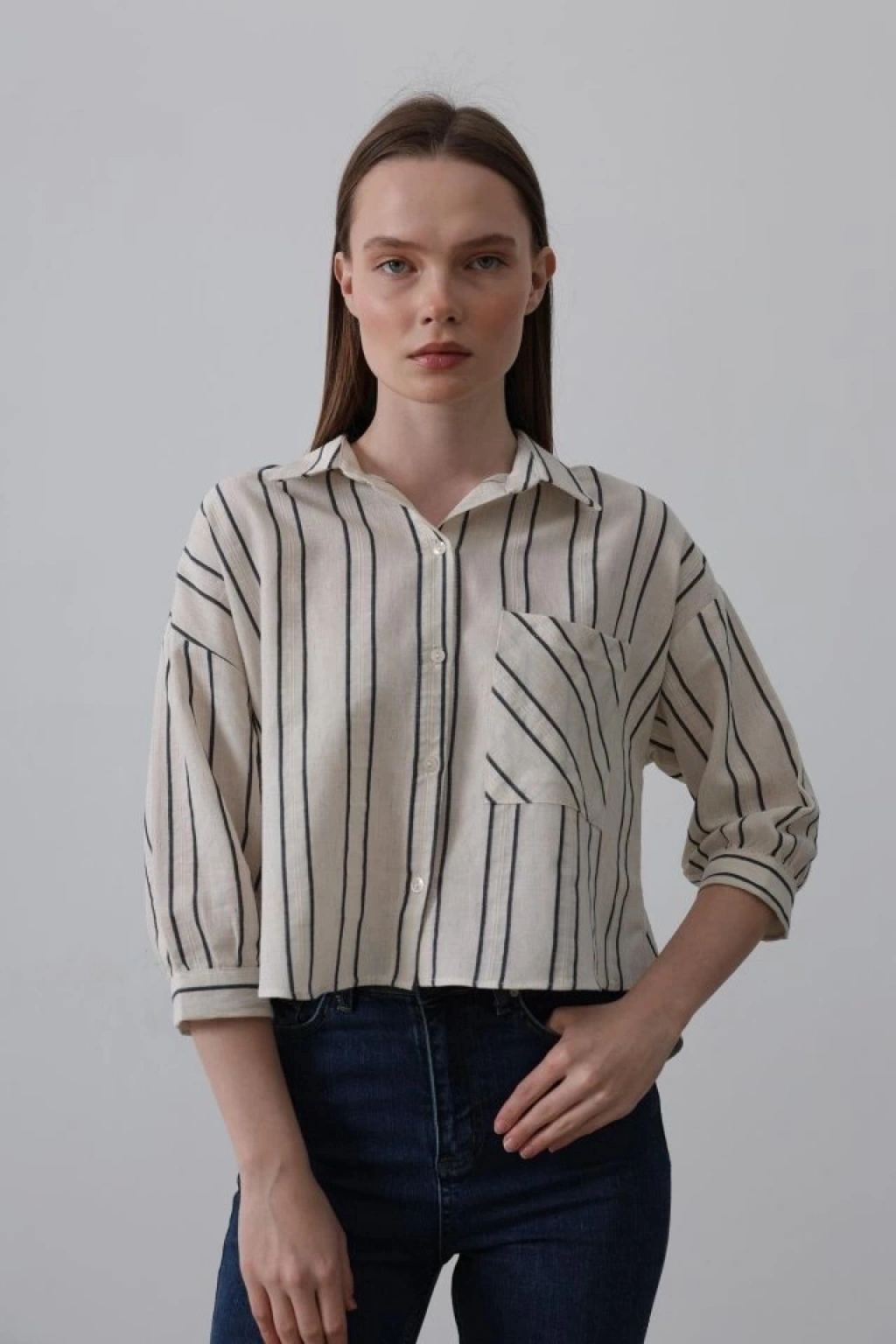 Çizgili Kısa Gömlek - Bej-Lacivert