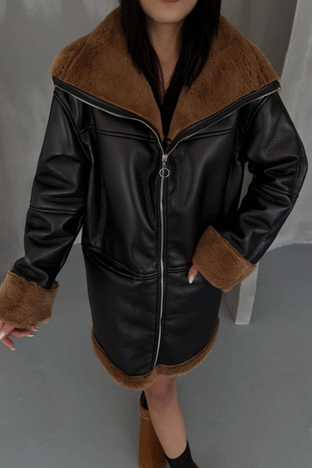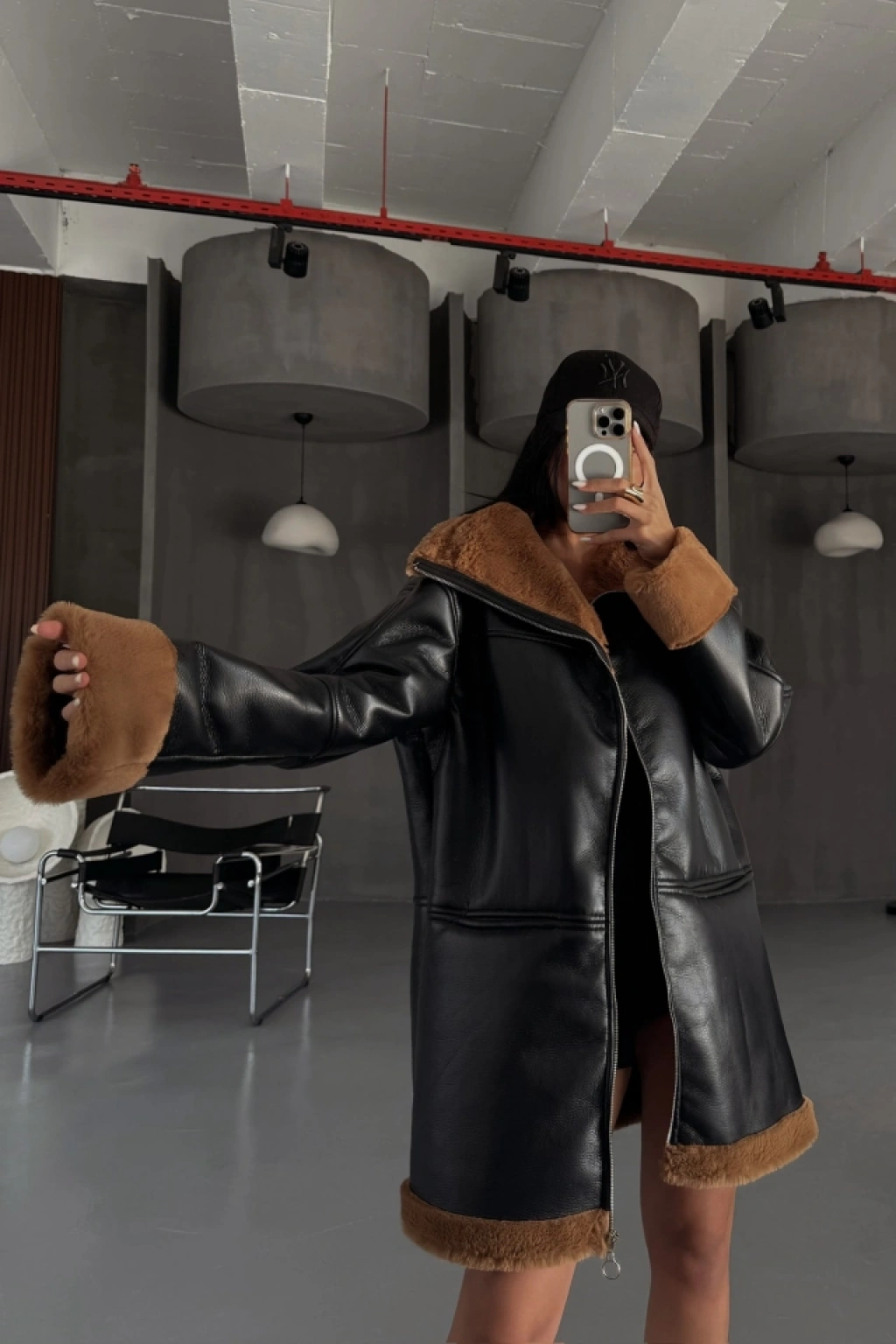 DERİ MONT KOL VE YAKA PELUŞ KAPAKSIZ CEP DETAYLI - Siyah-Taba
