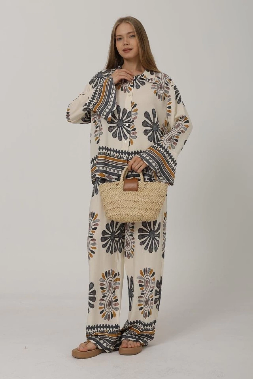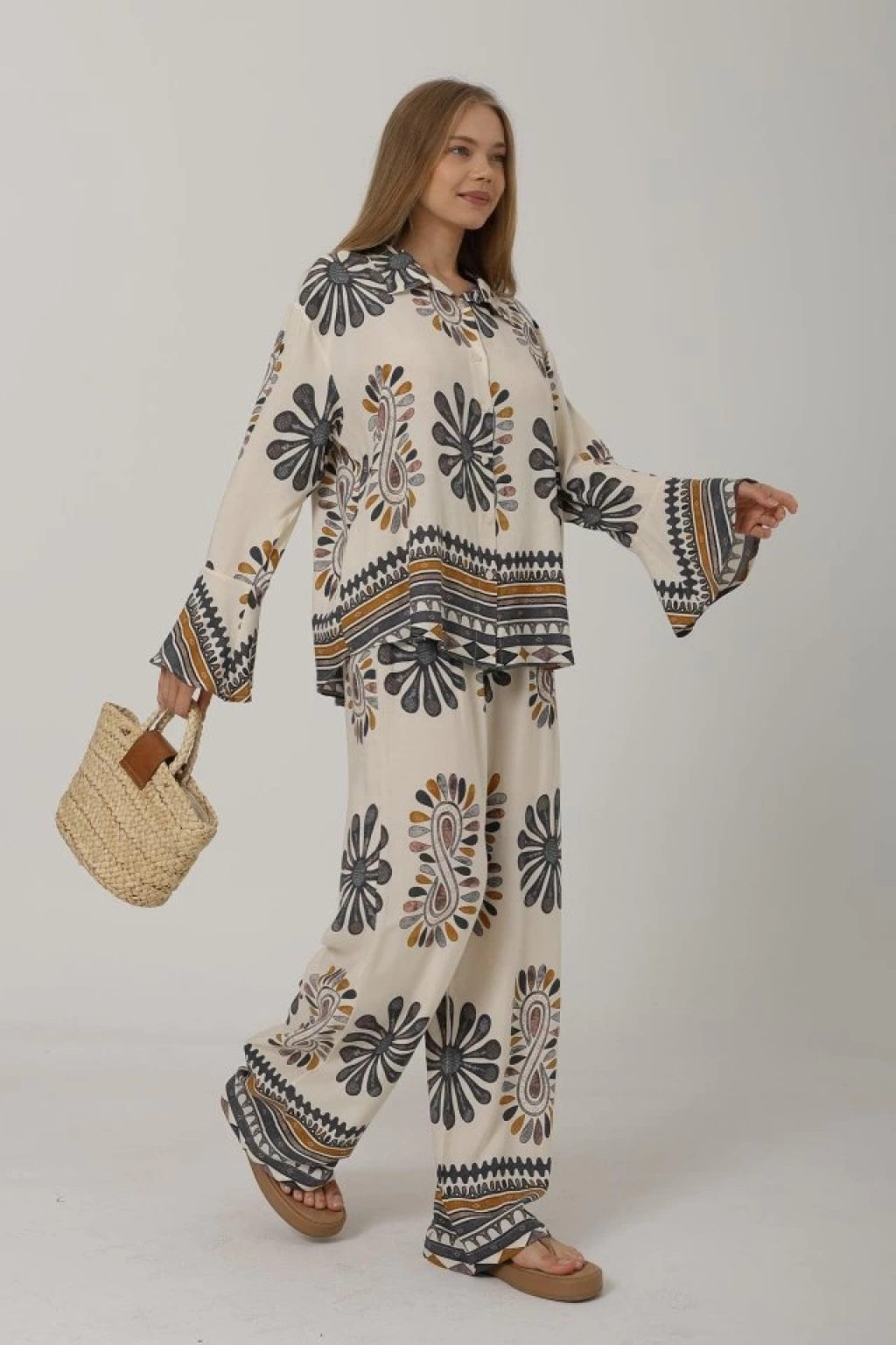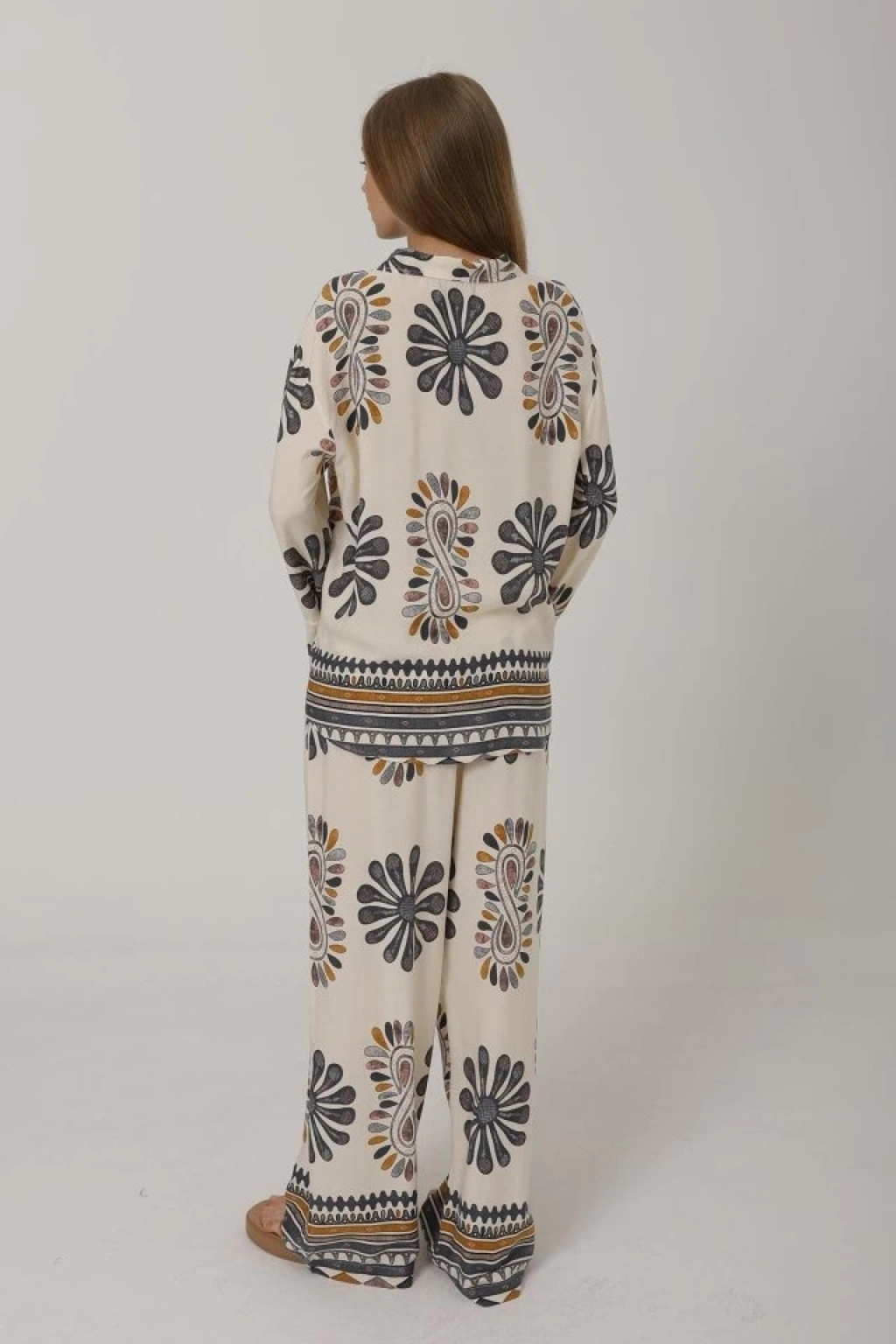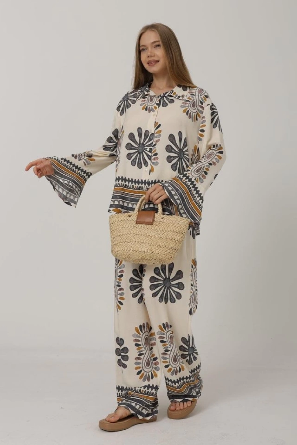 Desenli Kolları Volanlı Pantolon Takım - Antrasit
