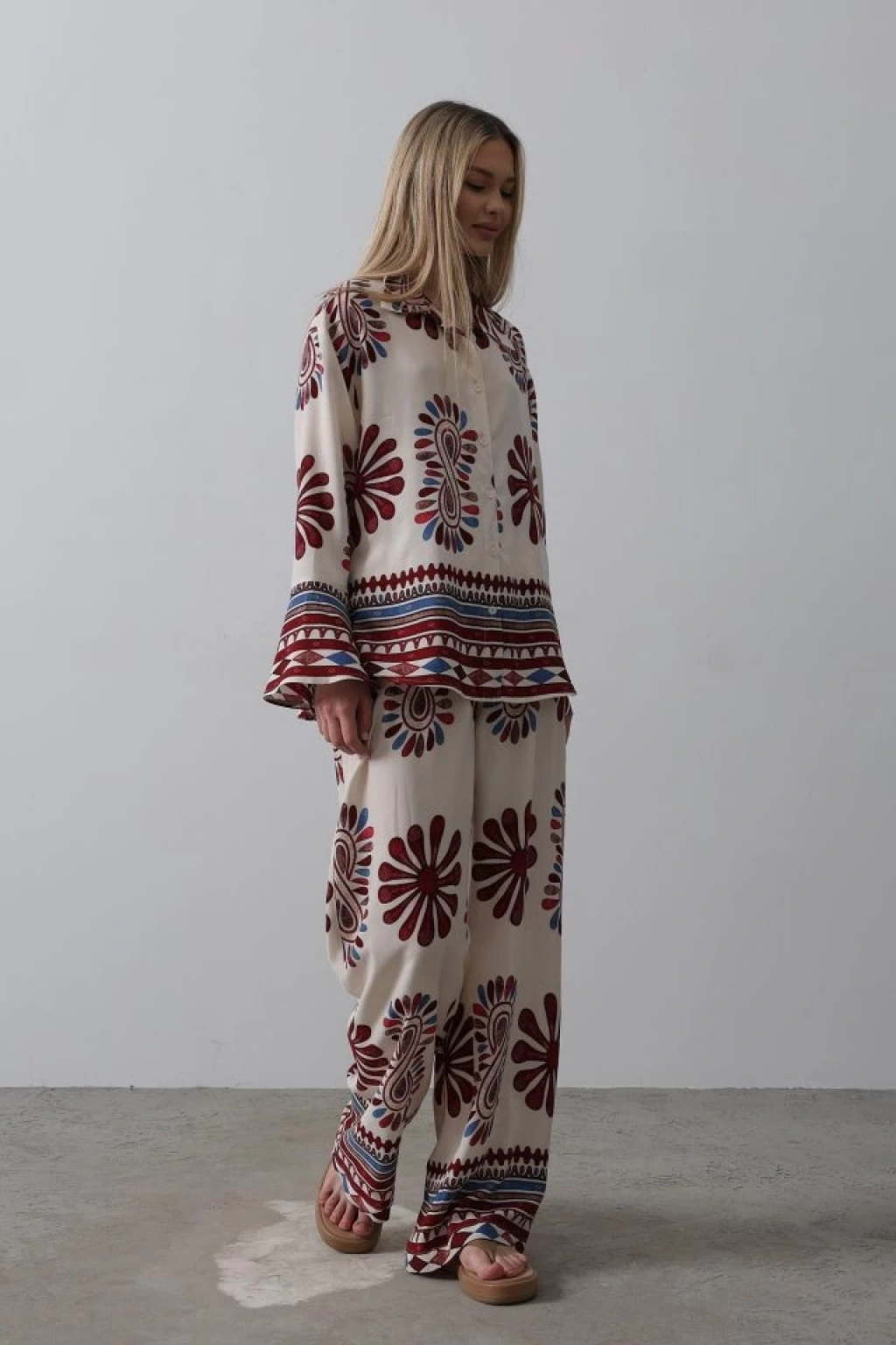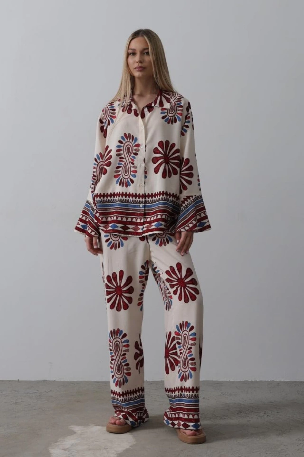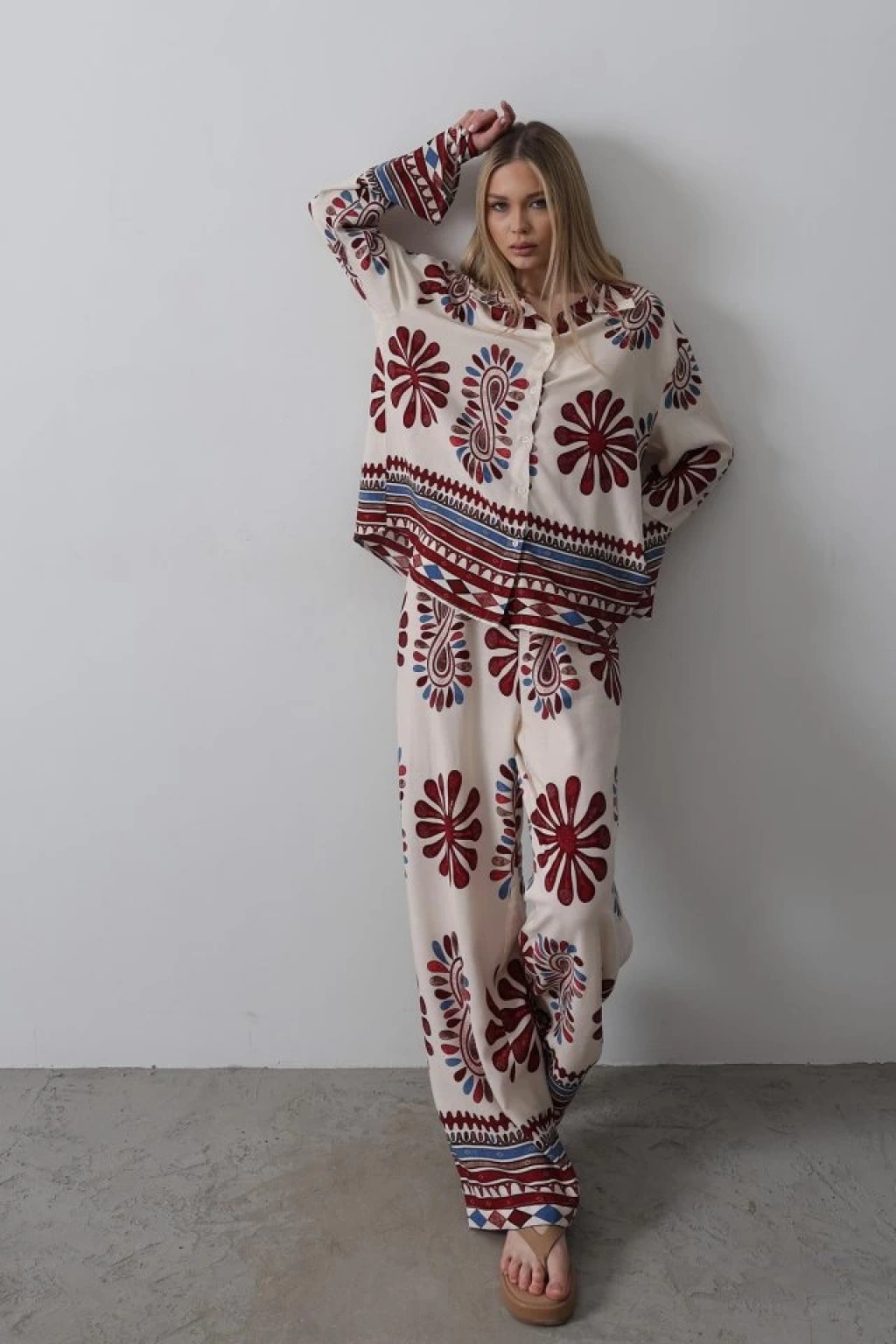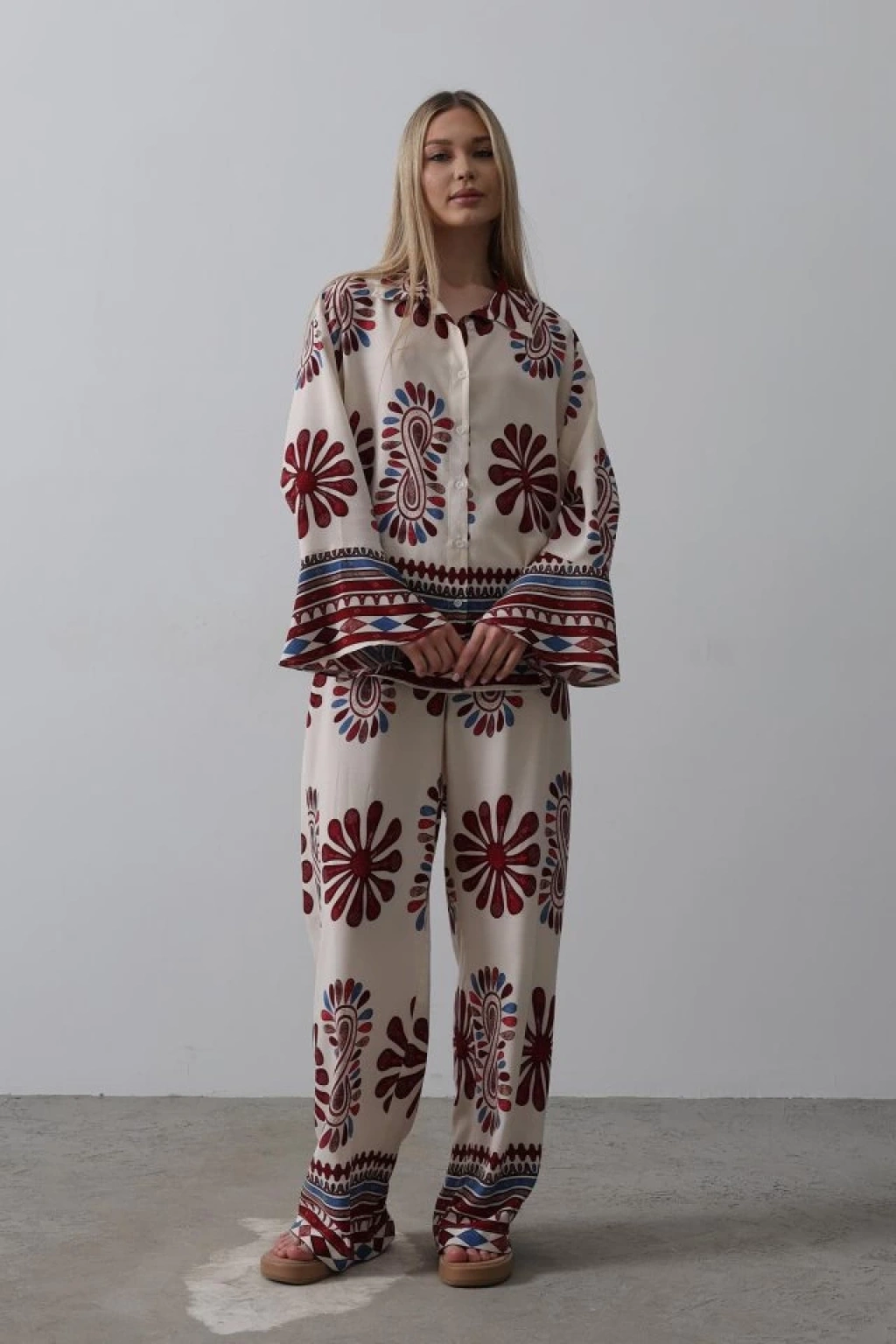 Desenli Kolları Volanlı Pantolon Takım - Kırmızı