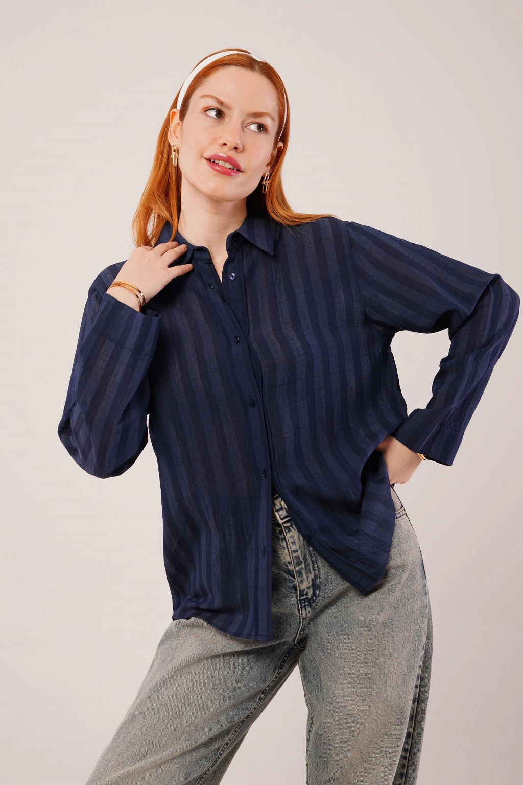 Düğmeli Ve Çizgi Detaylı Lacivert Gömlek