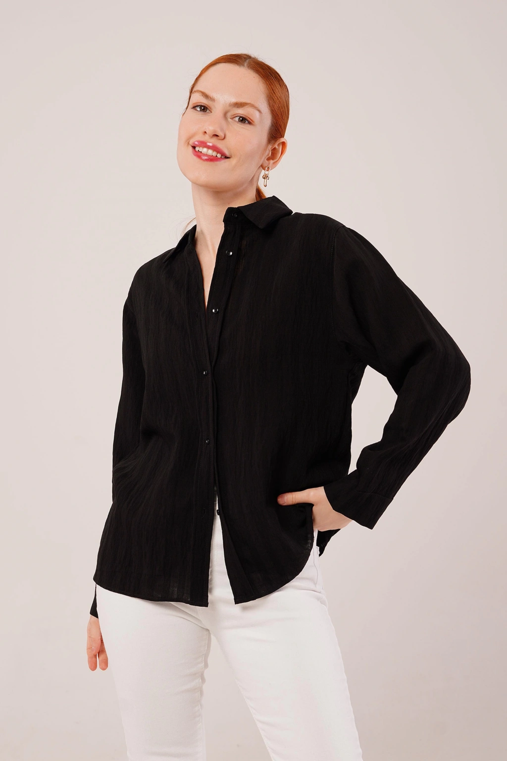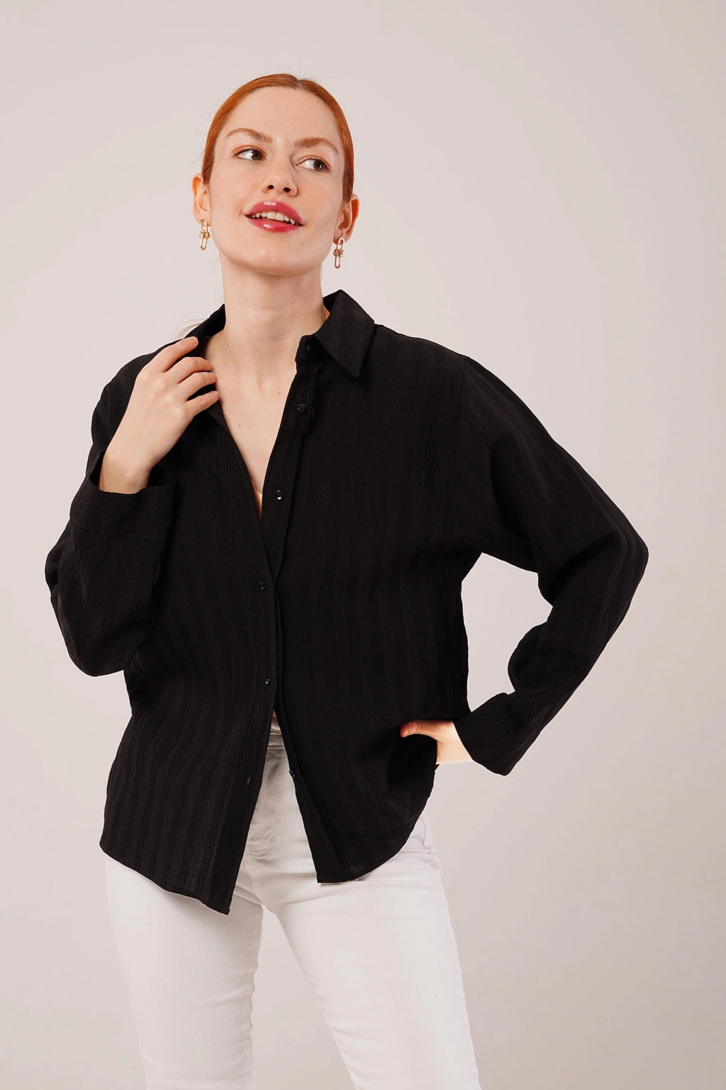 Düğmeli Ve Çizgi Detaylı Siyah Gömlek