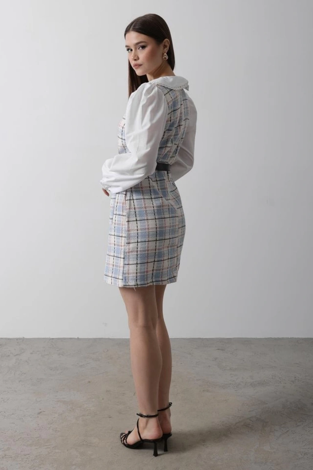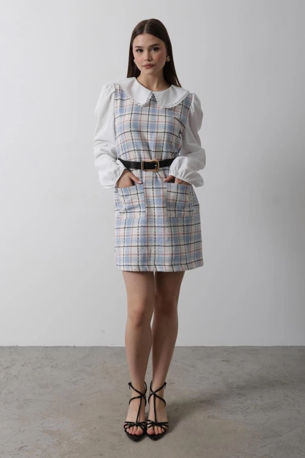 Ekoseli Gömlek Detaylı Elbise - Mavi