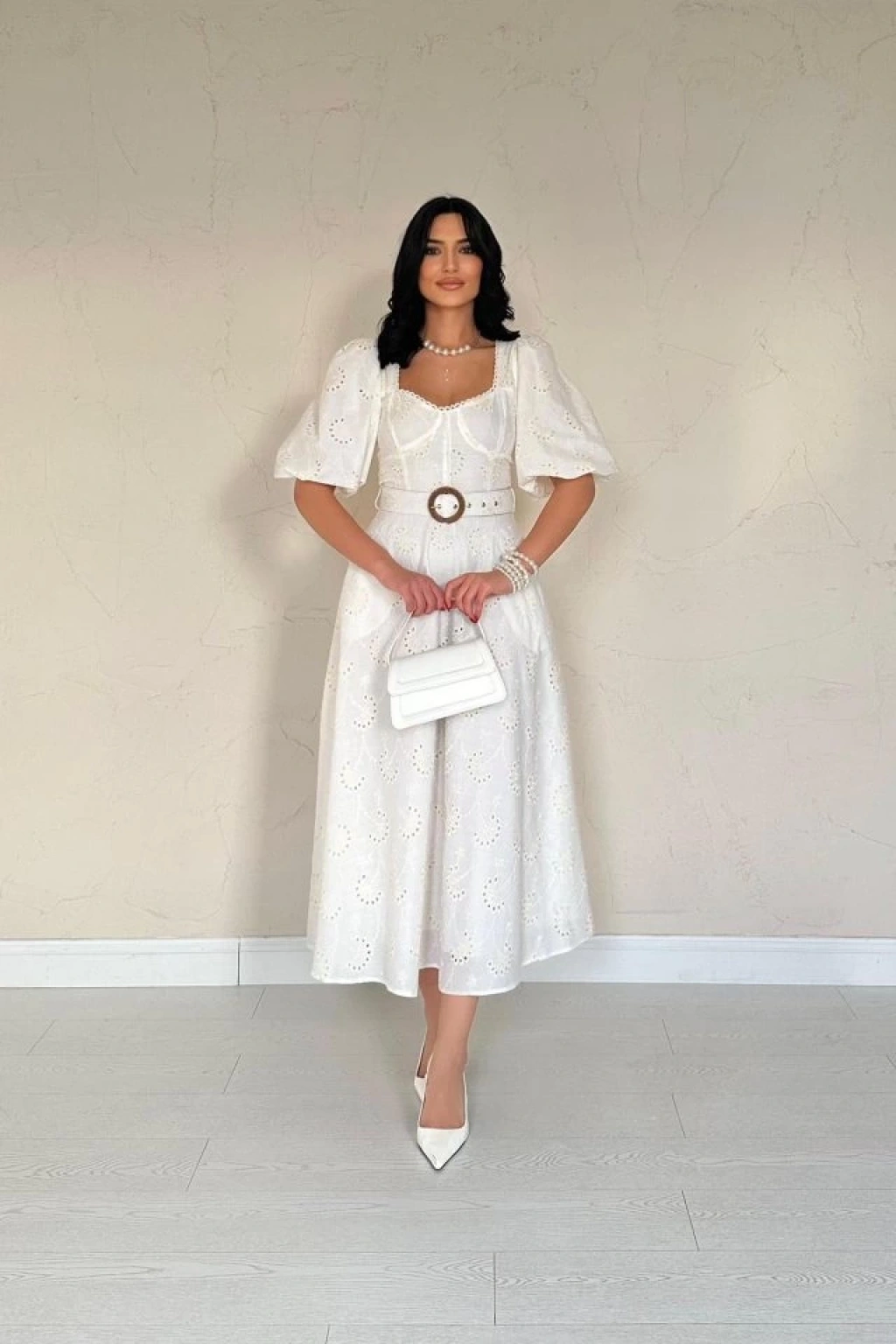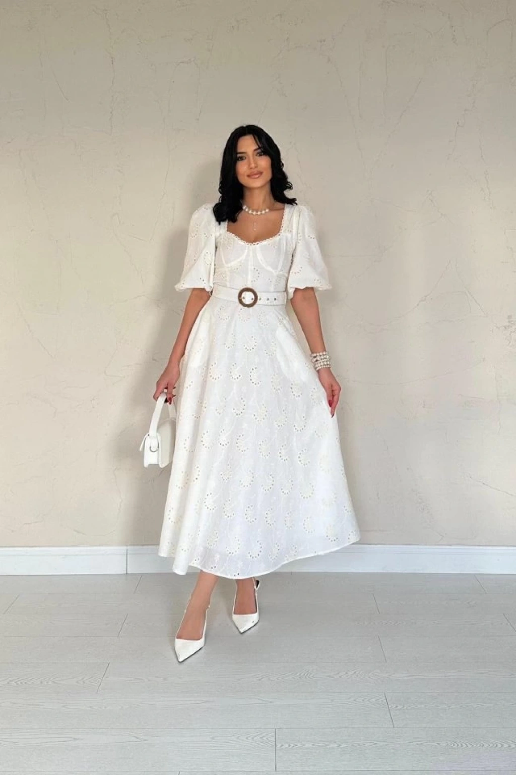 Ekru Göğüs Kup Detaylı Kemerli Brode Elbise
