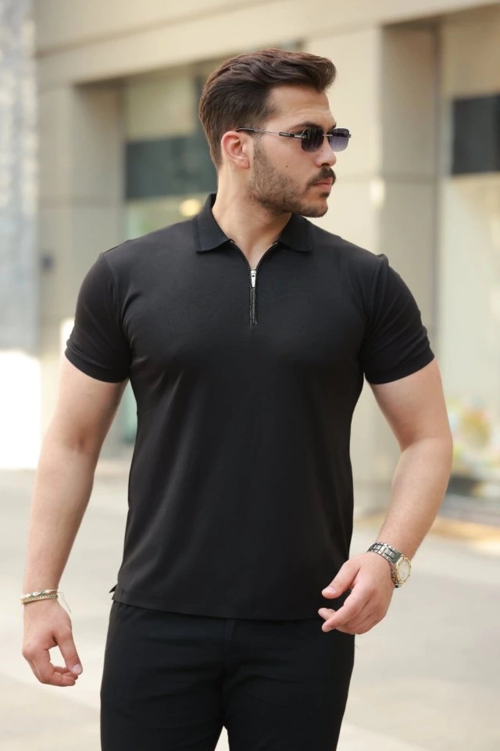 Erkek Fermuar Yakalı Kolları Desenli Kısa Kollu Tişört