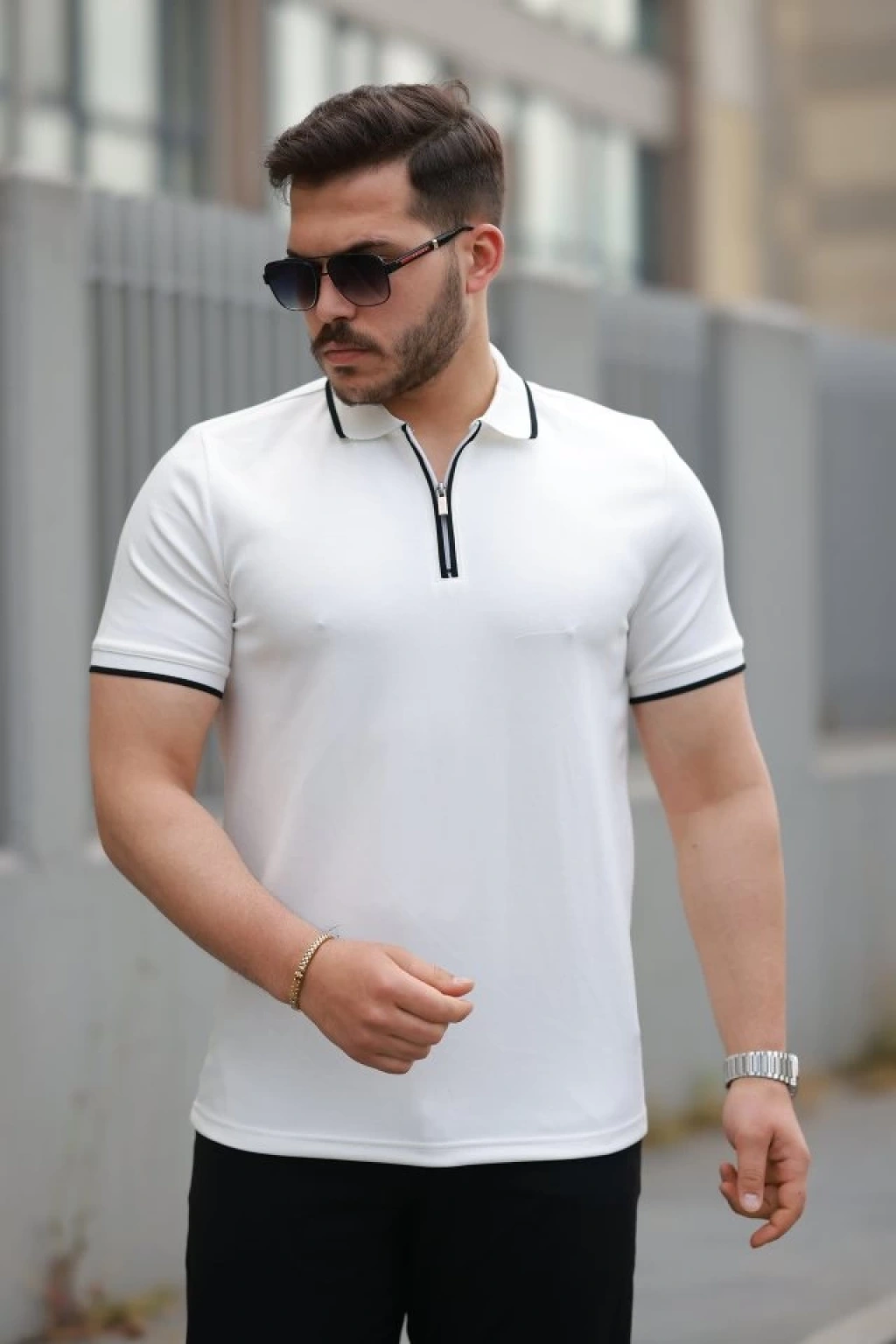 Erkek Fermuar Yakalı Kolları Desenli Kısa Kollu Tişört