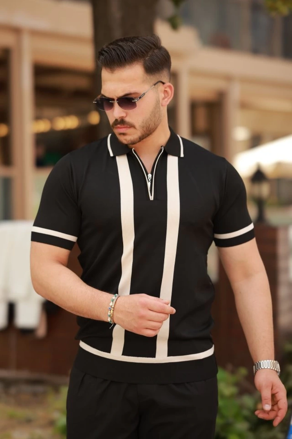 Erkek Fermuar Yakalı Kolları Desenli Kısa Kollu Tişört