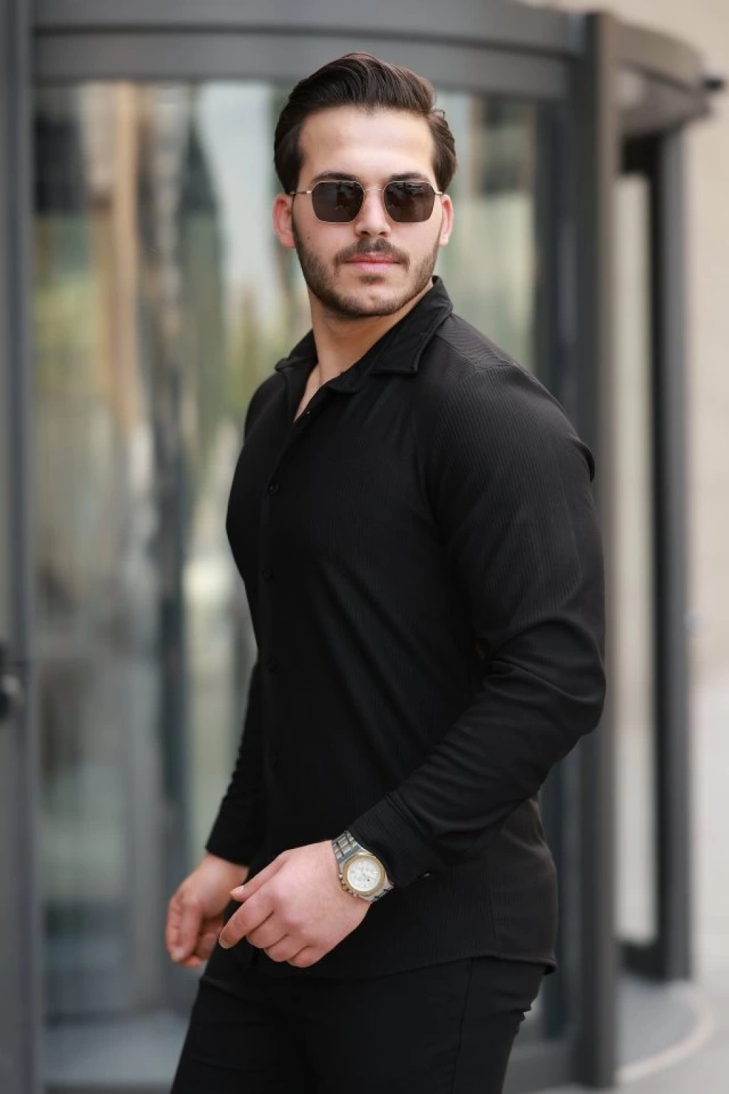 Erkek İki İplik Kumaş Dijital Baskılı Gömlek - Siyah
