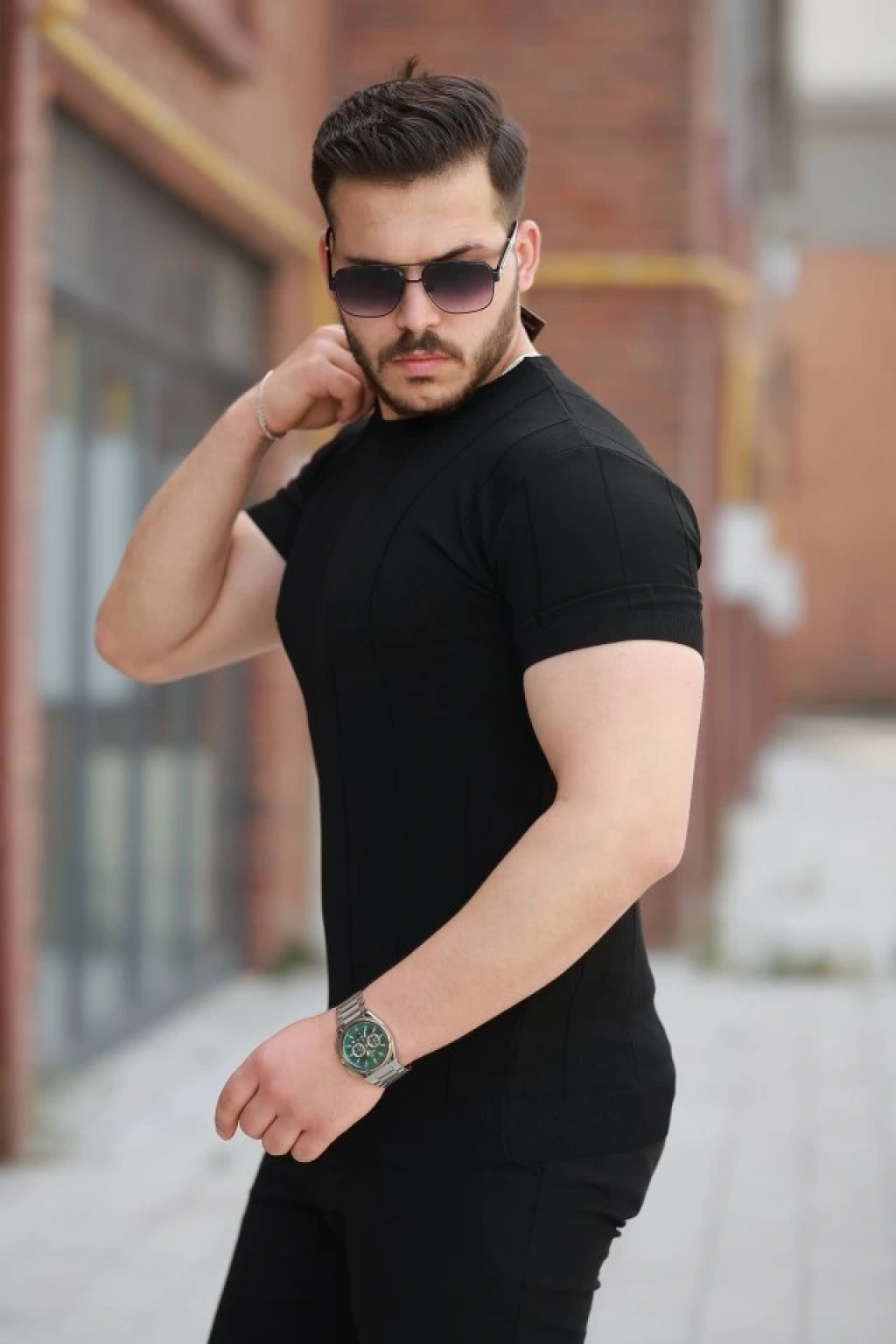 Erkek Ince çizgi Dokulu Bisiklet Yaka Kısa Kollu T-shirt