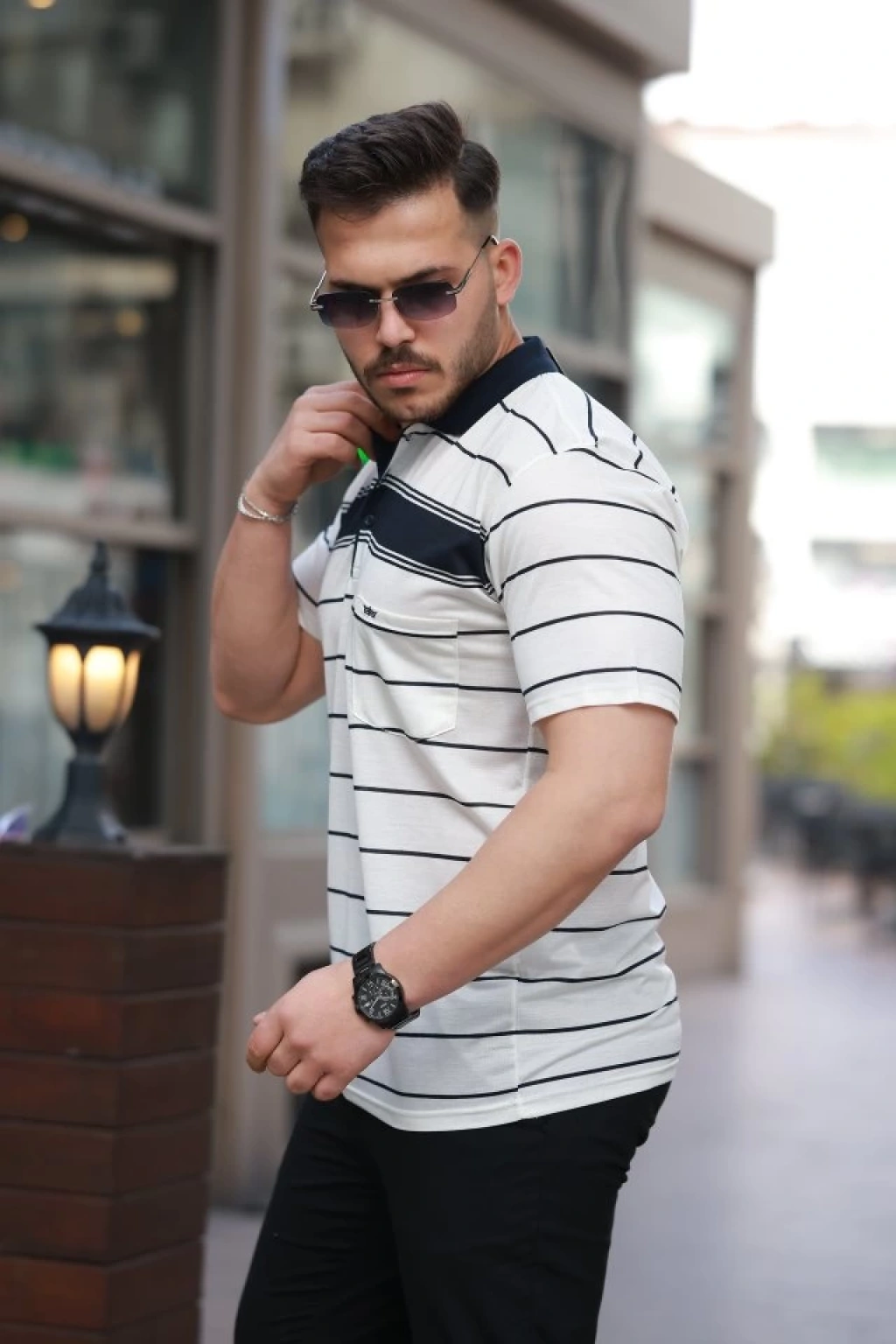 Erkek Yakalı çizgili Kısa Kollu T-shirt