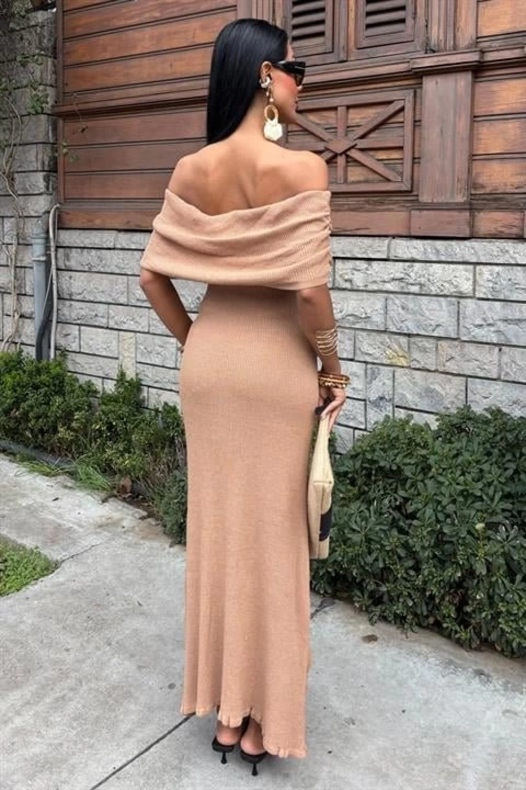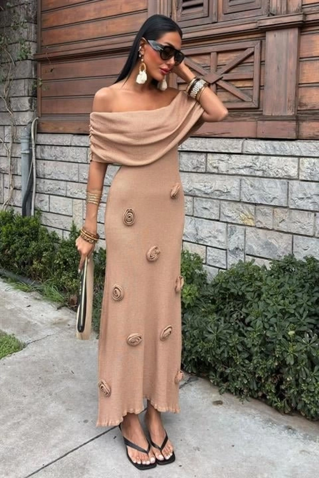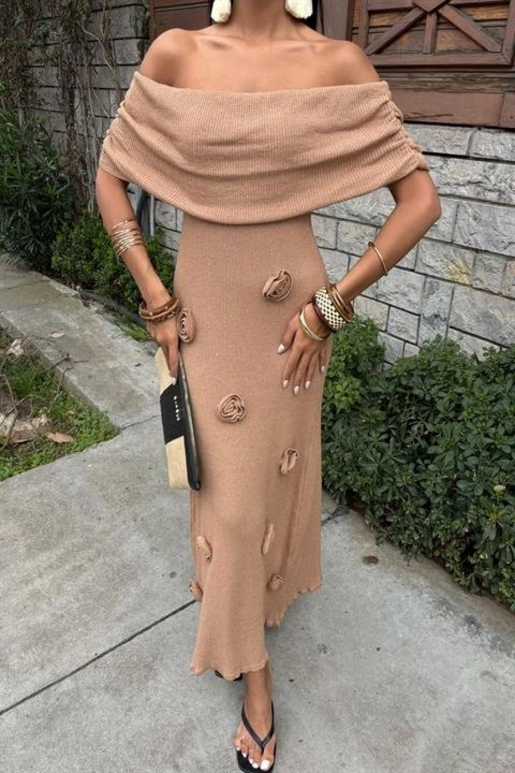 Eteği Gül Detay Madonna Yaka Elbise 2863