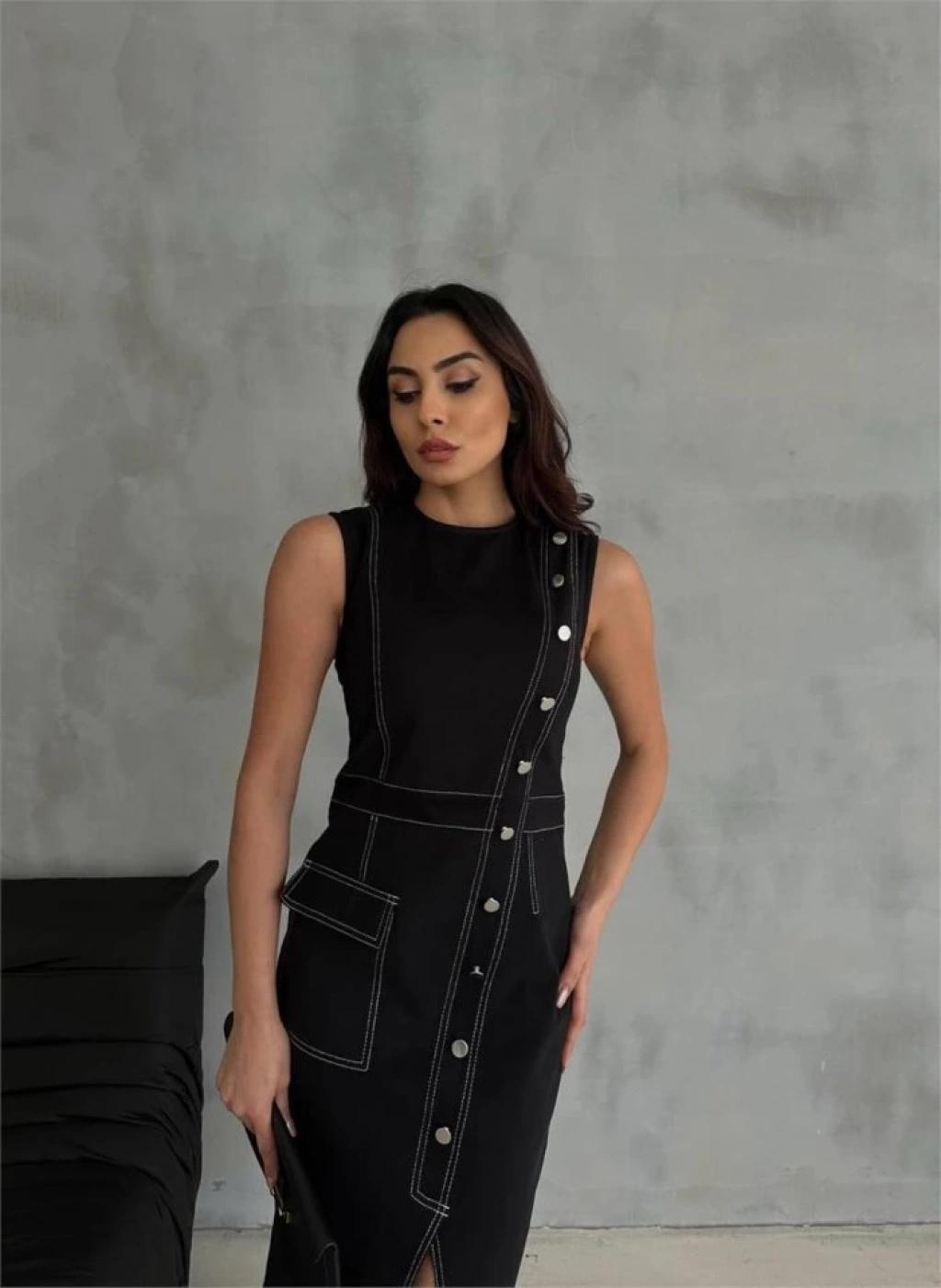 GABARDİN KALEM ELBİSE DÜĞME VE YIRTMAÇ DETAYLI - Bej