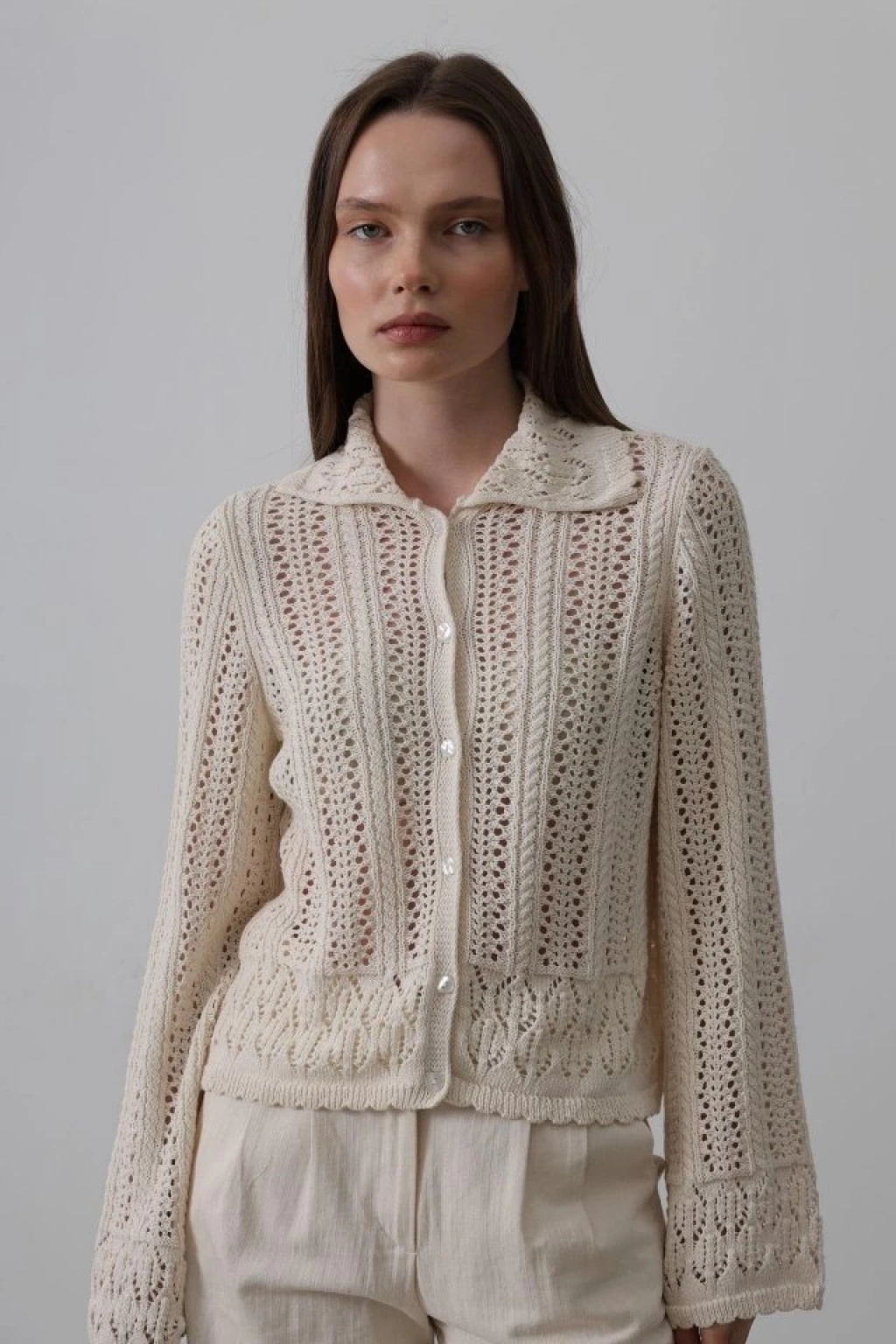 Gömlek Yaka Uzun Kol Triko - Ekru