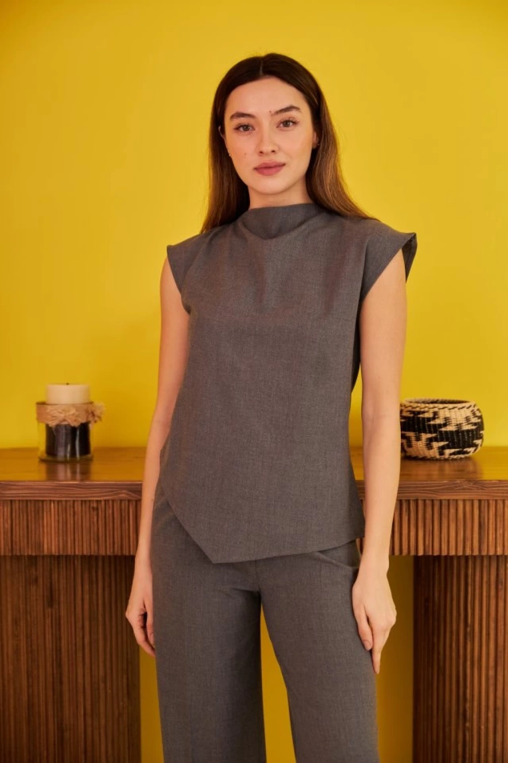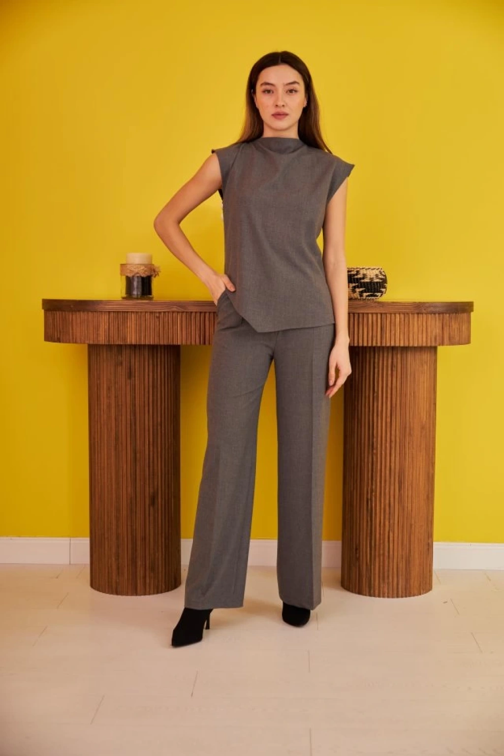 Gri Sıfır Kol Düğmeli Gömlek Takım