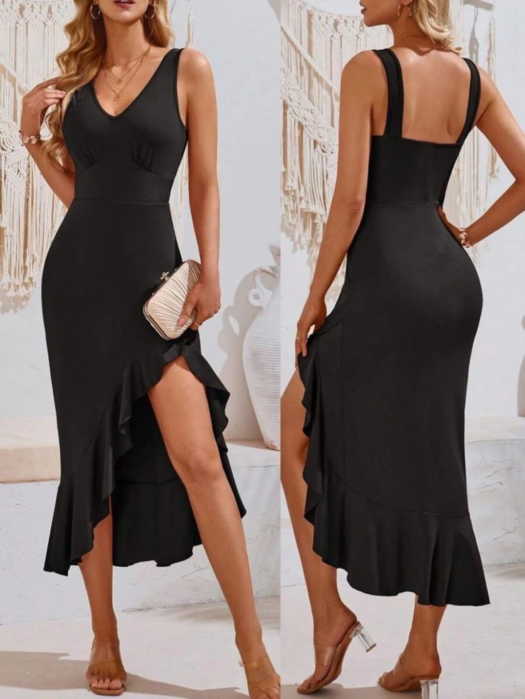 Kadın Askılı V Yakalı önden Fırfırlı Uzun Dalgıç Elbise