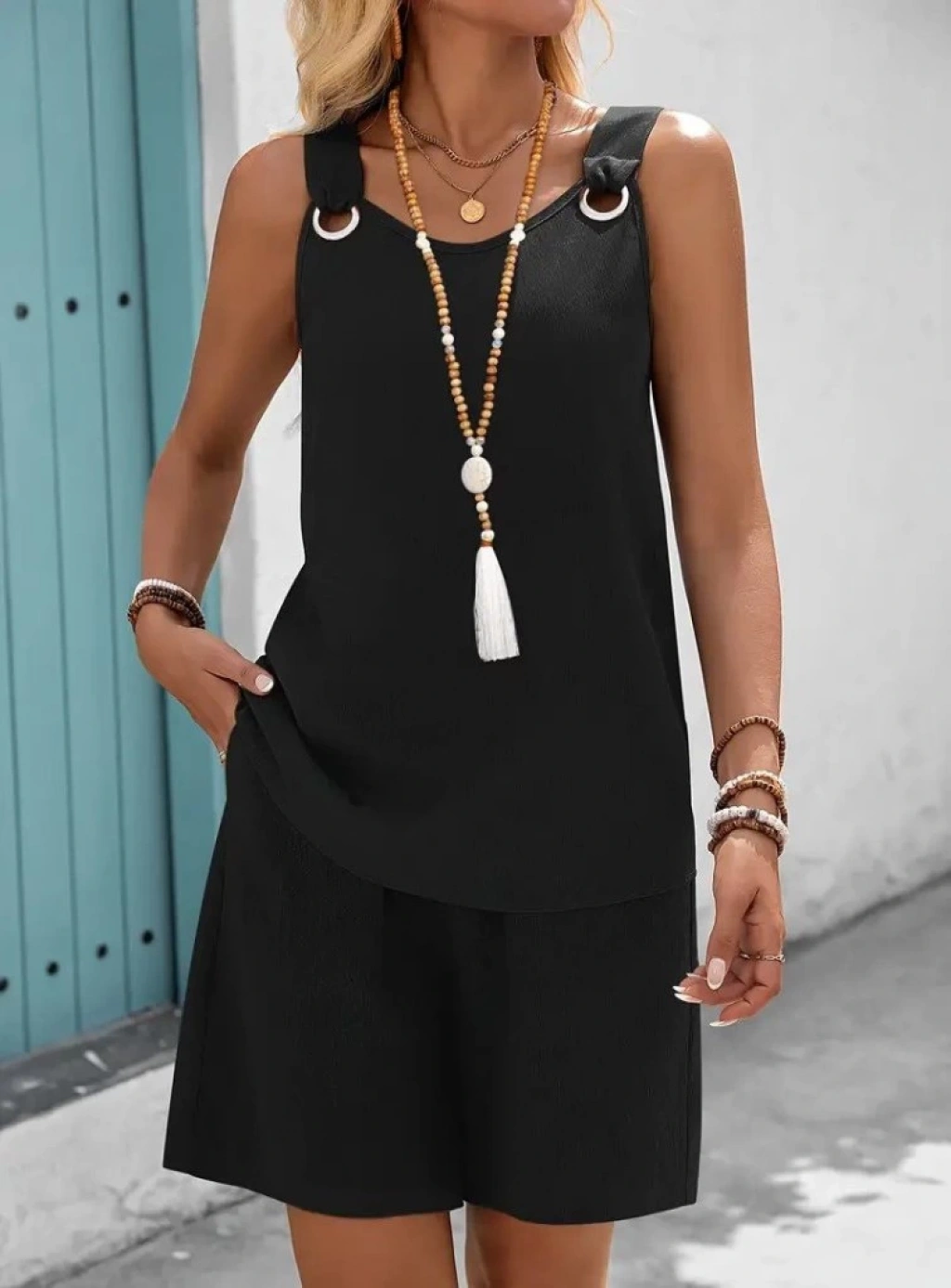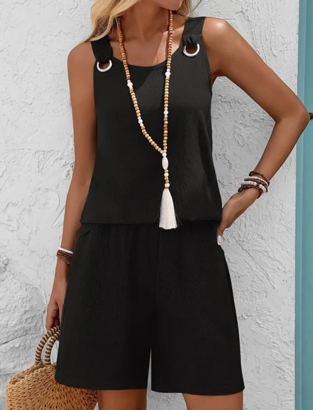 Kadın Askılı Yuvarlak Yaka Kuş Gözü Detaylı Bürümcük Bluz Ve Short Ikili Takım