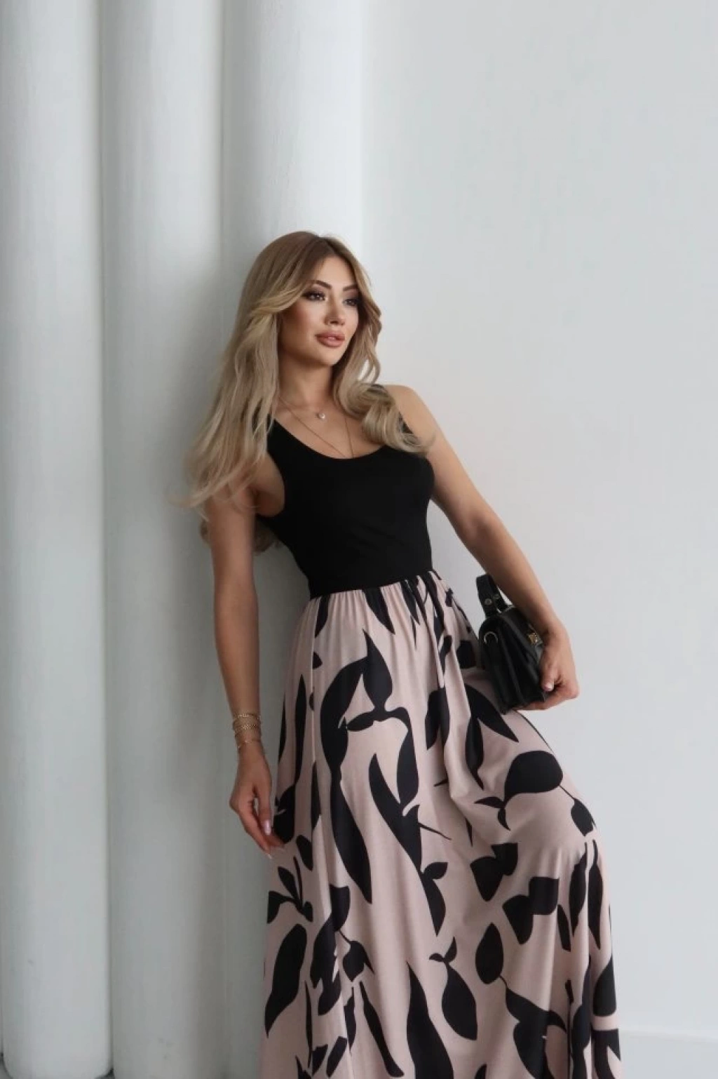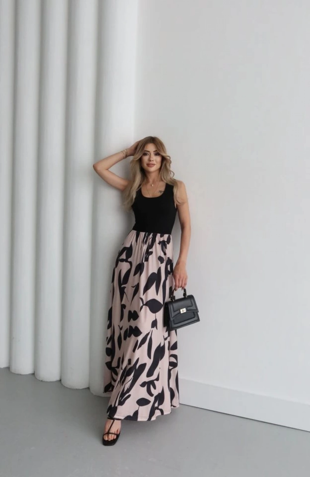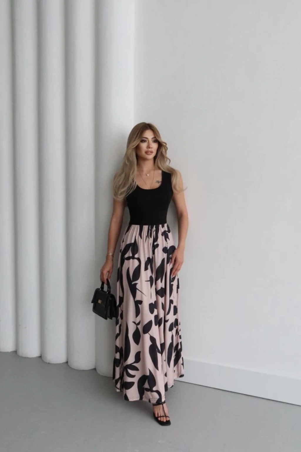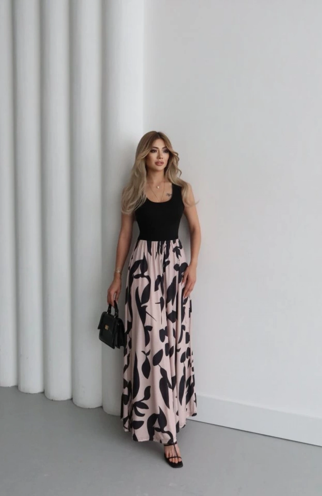 Kadın Askılı Yuvarlak Yaka üst Viskon Alt Desenli Uzun Süprem Elbise
