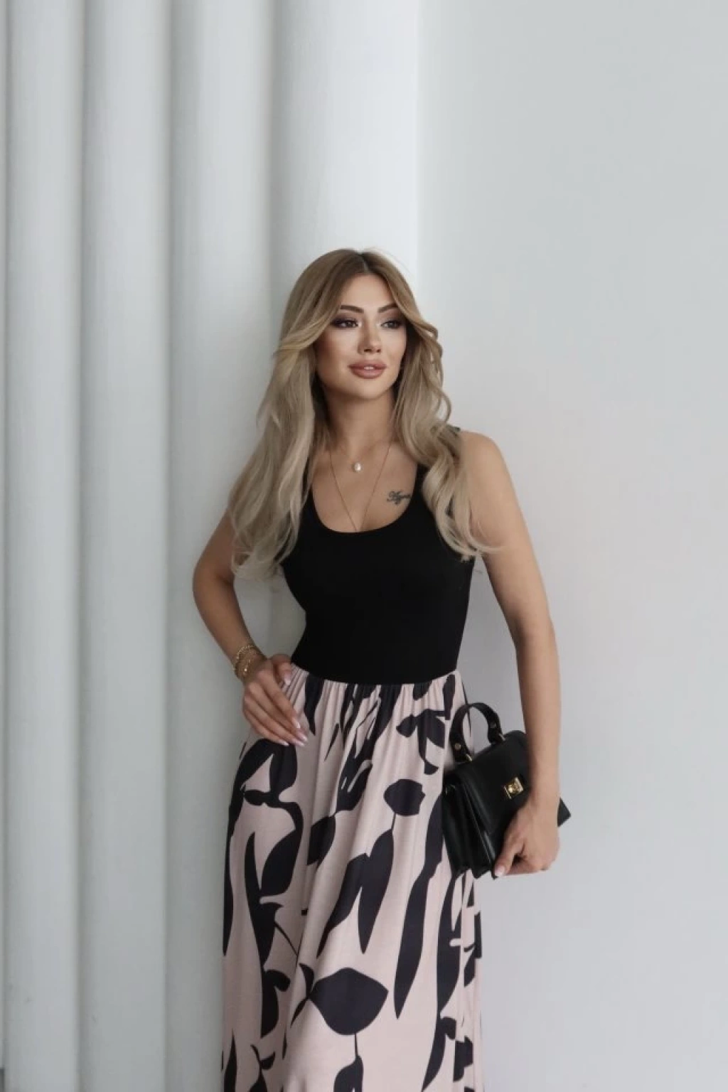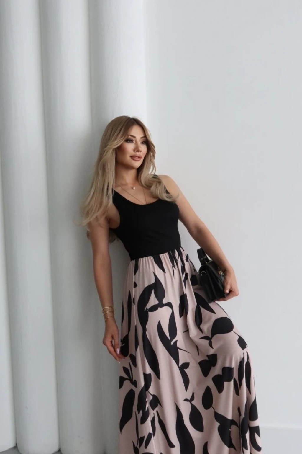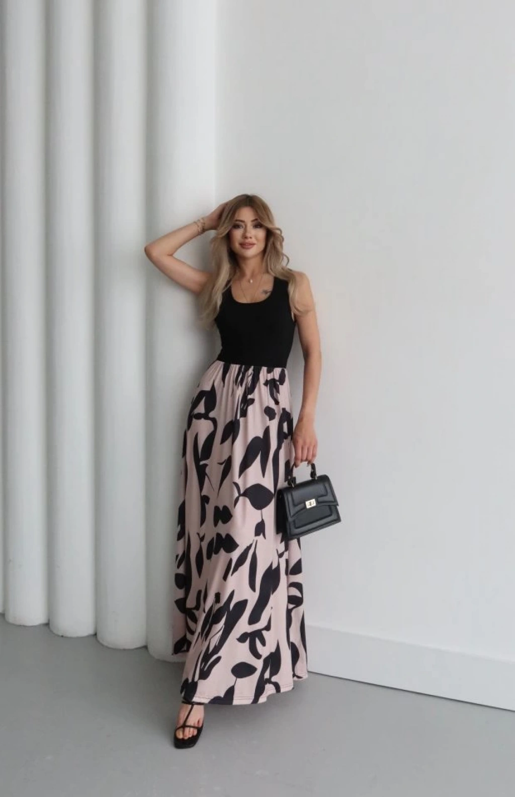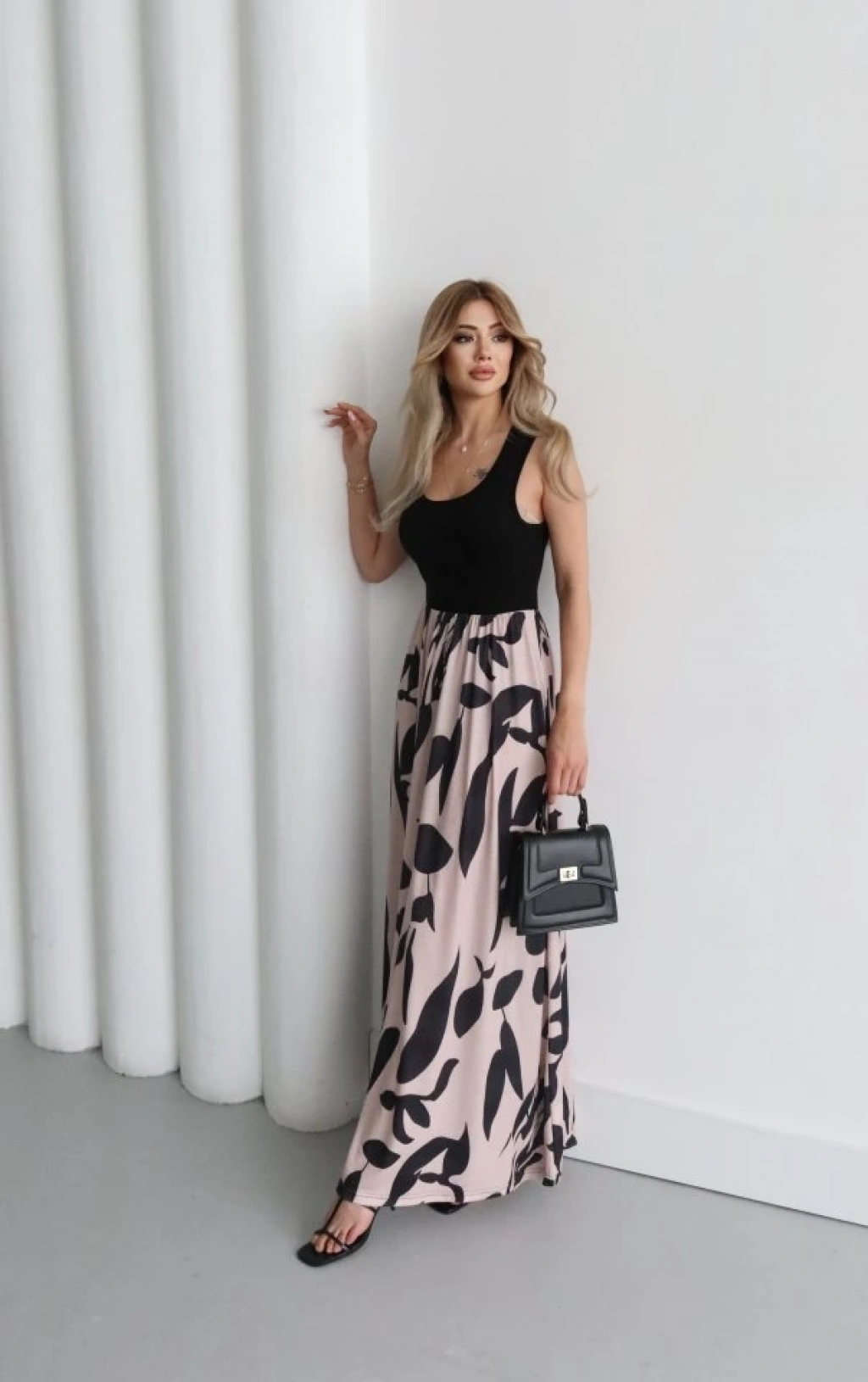 Kadın Askılı Yuvarlak Yaka üst Viskon Alt Desenli Uzun Süprem Elbise