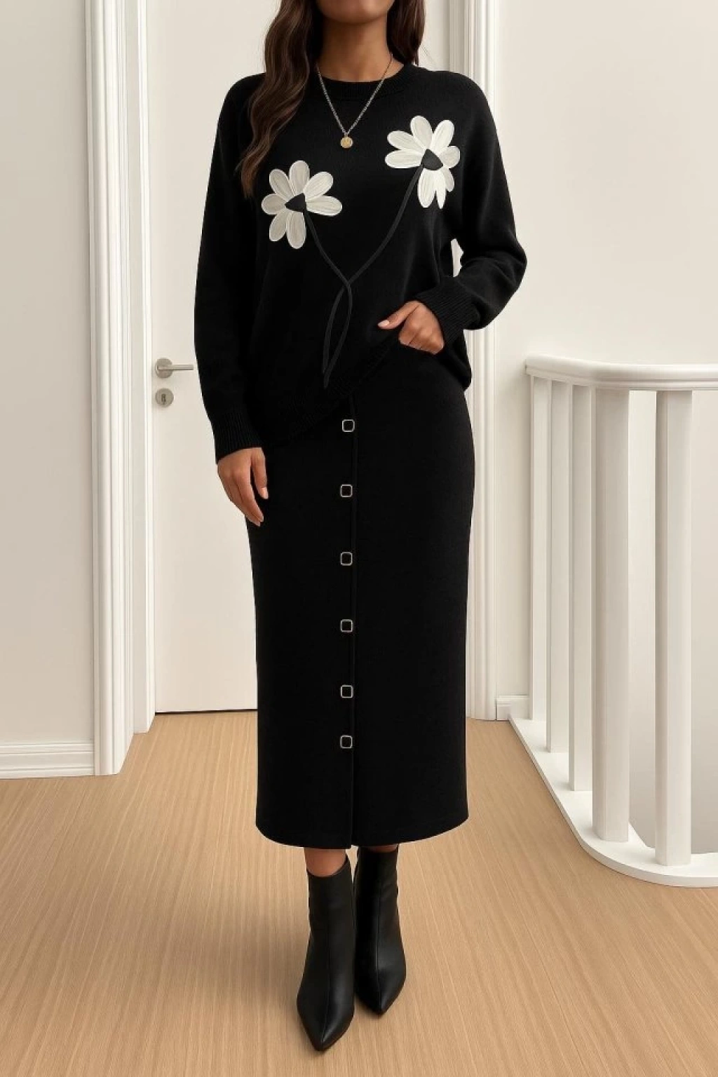 Kadın Bluz çiçek Desenli Detay Etek Düğme Detay ıkılı Takım