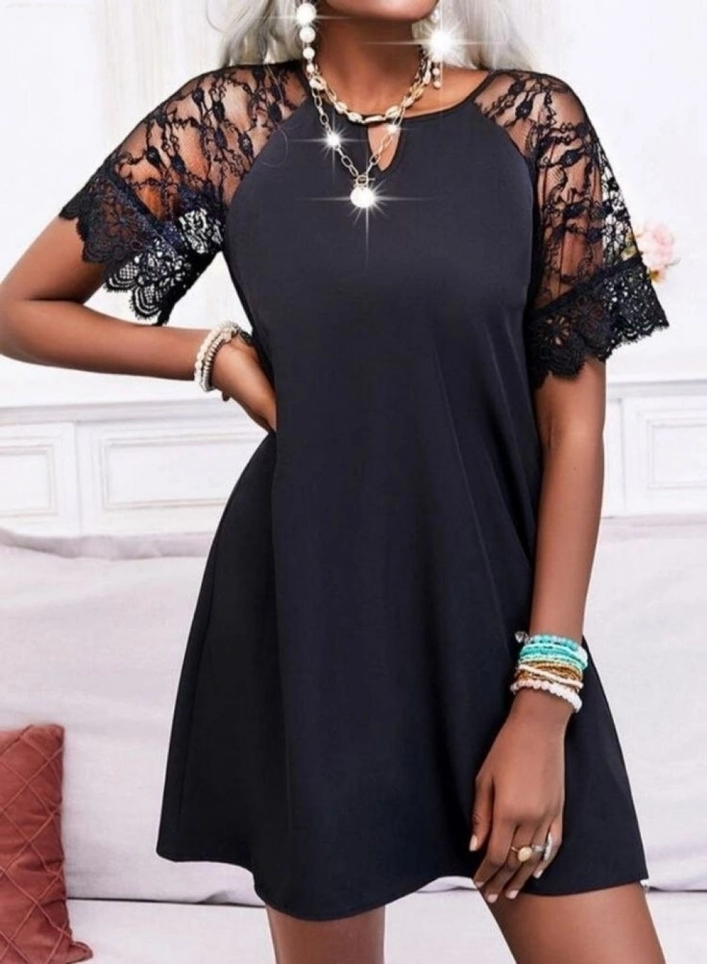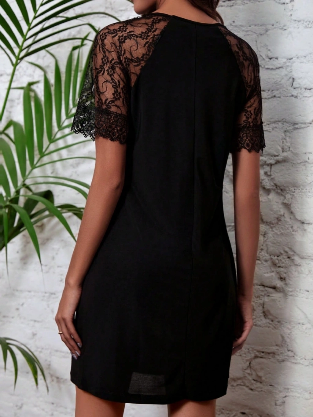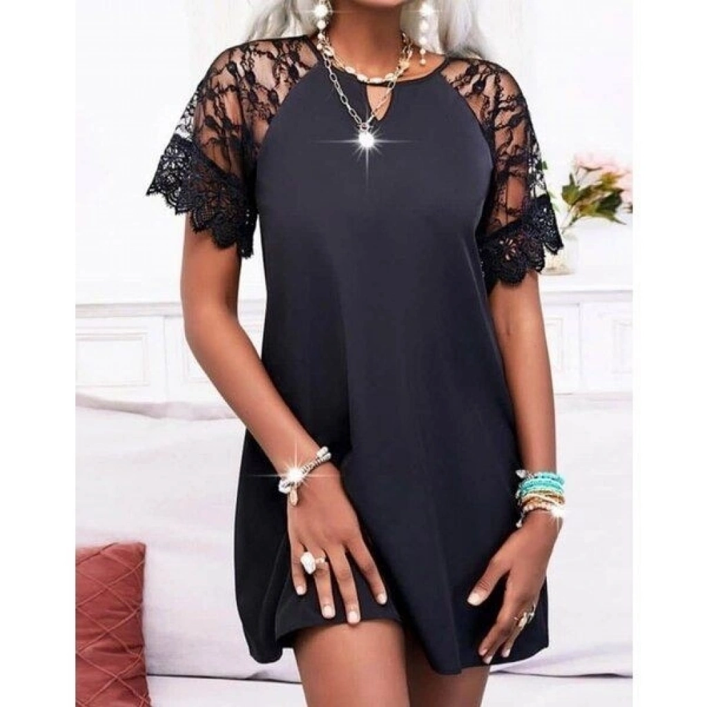 Kadın Dantelli Kısa Kollu Damla Yaka Krep Elbise