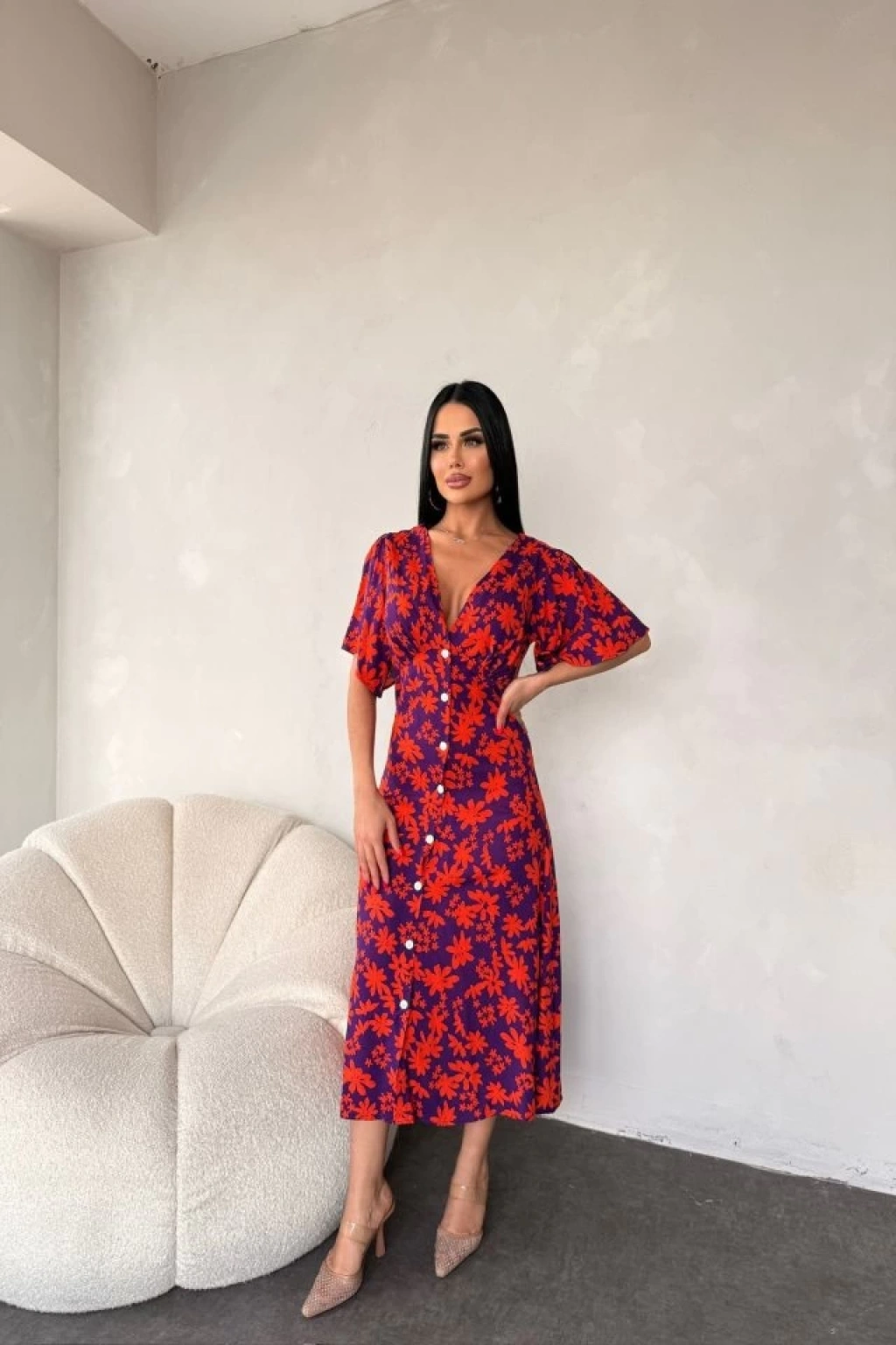 Kadın Göğüs Dekolteli Yaprak Desen Dokuma Viskon Kumaş Maxi Boy Elbise