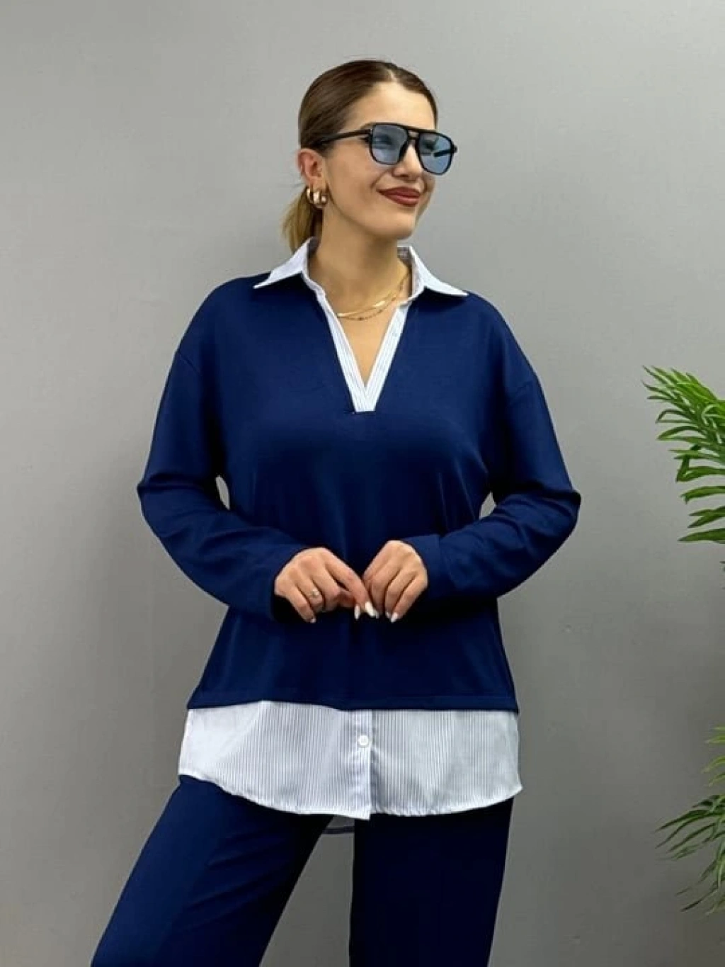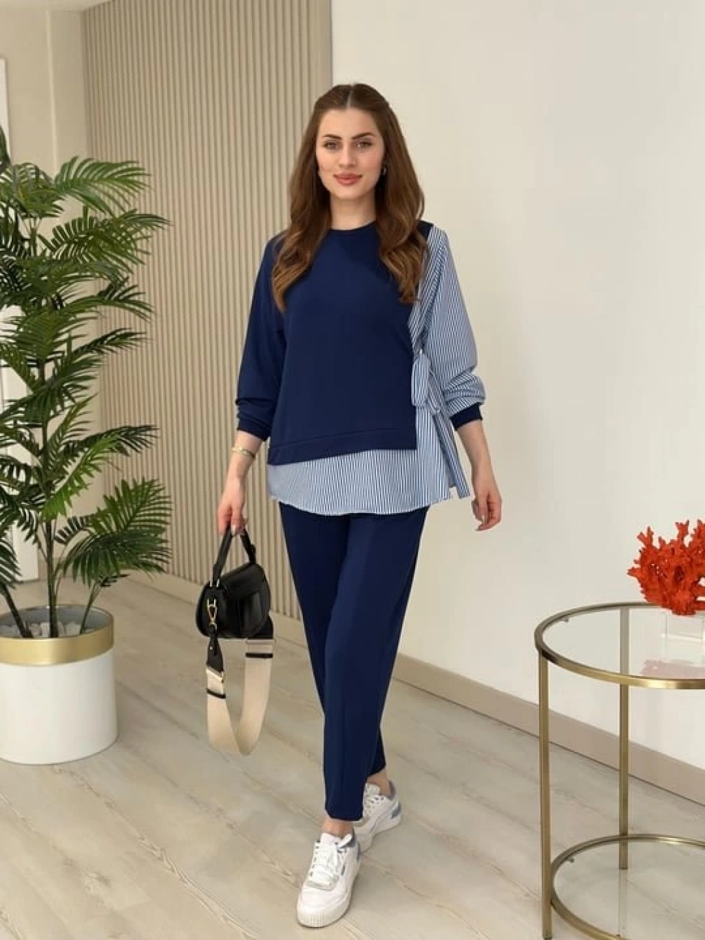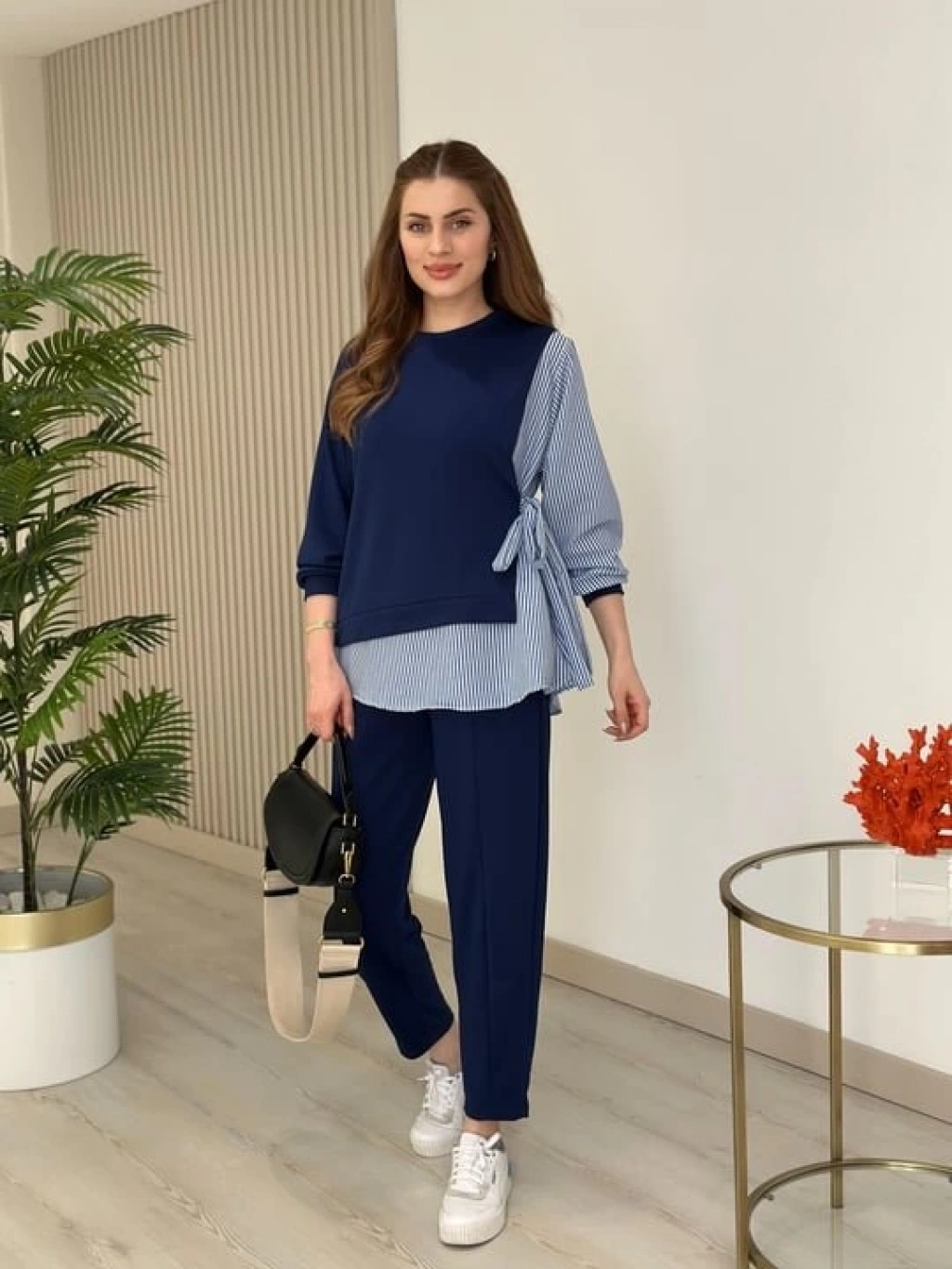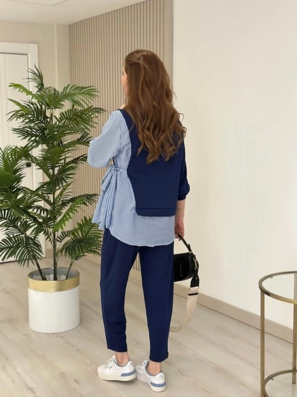 Kadın Gömlek Detay çizgili Yandan Bağlamalı Ikili Takım