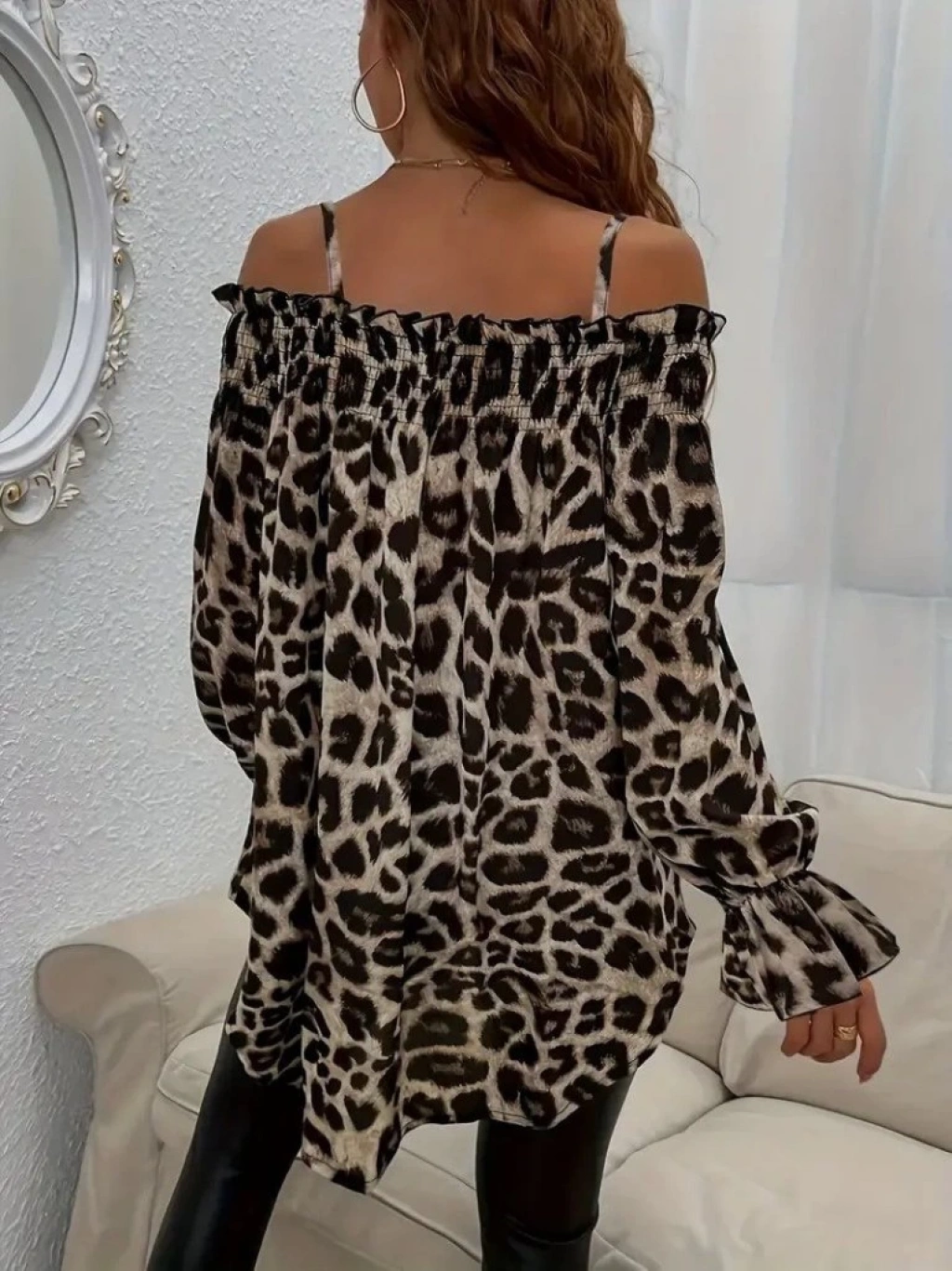 Kadın Ip Askılı Omuzlardan Açık Leopar Desenli Asimetrik Kesim Süprem Bluz