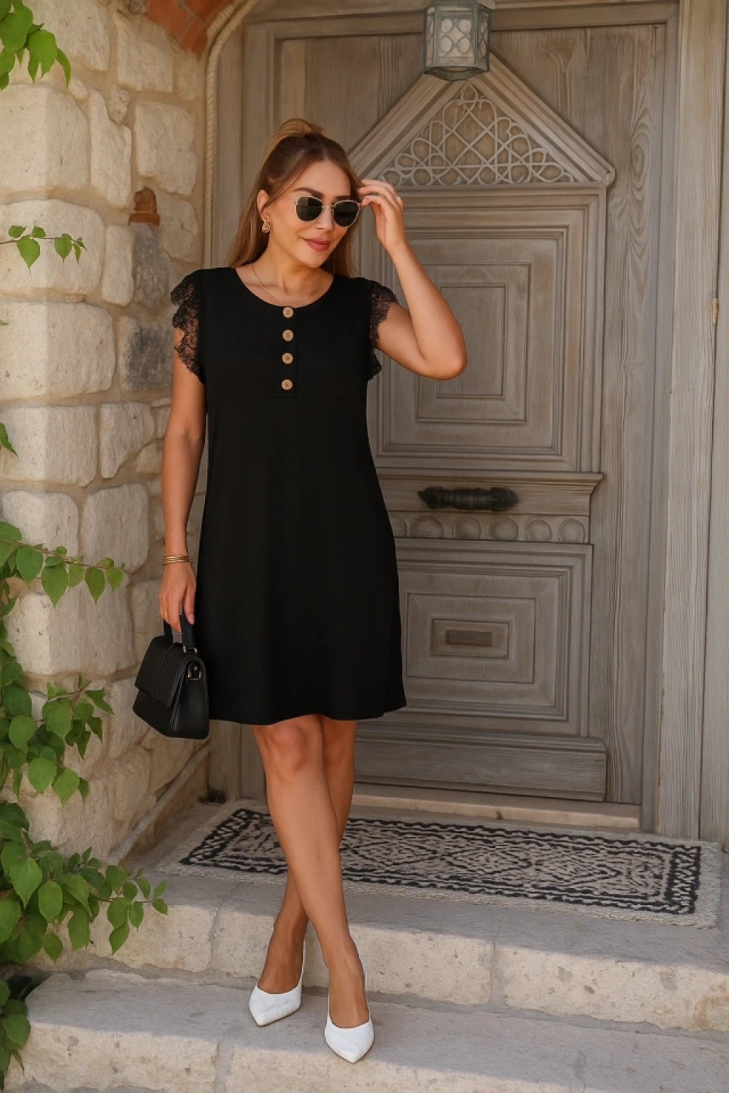 Kadın Kısa Dantel Kollu önden Düğmeli Viskon Elbise