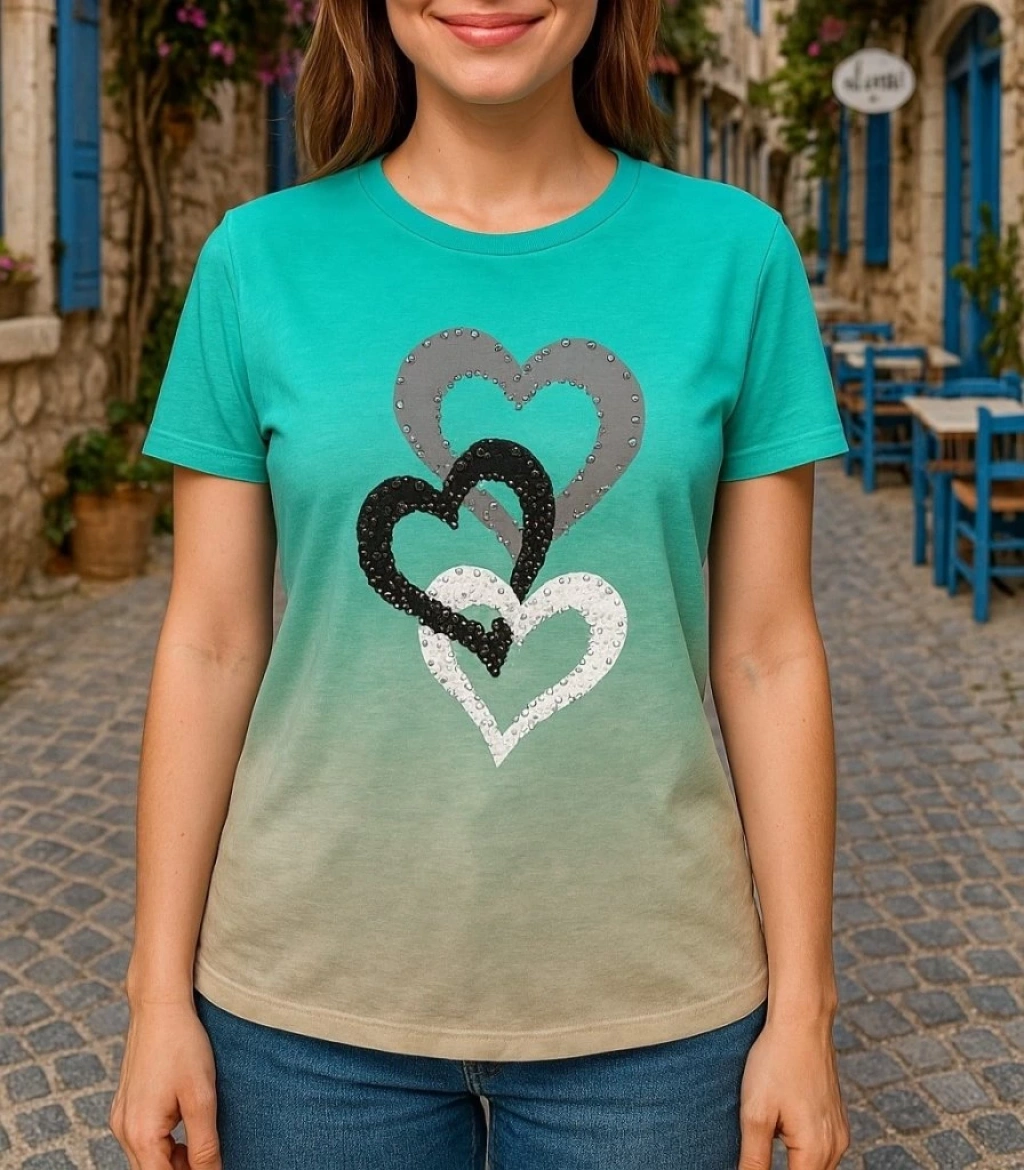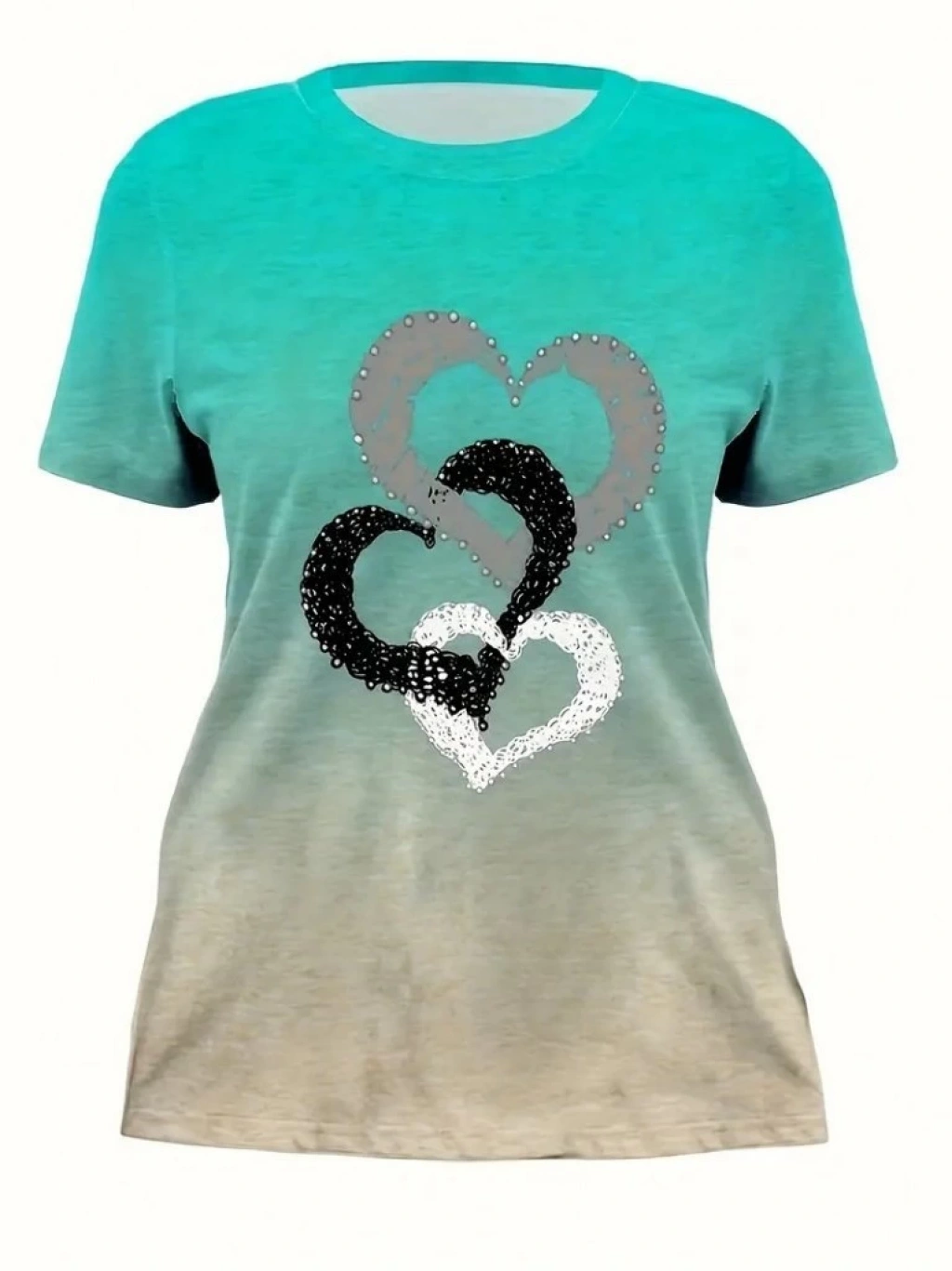 Kadın Kısa Kollu Bisiklet Yaka Kalp Baskılı Süprem Bluz