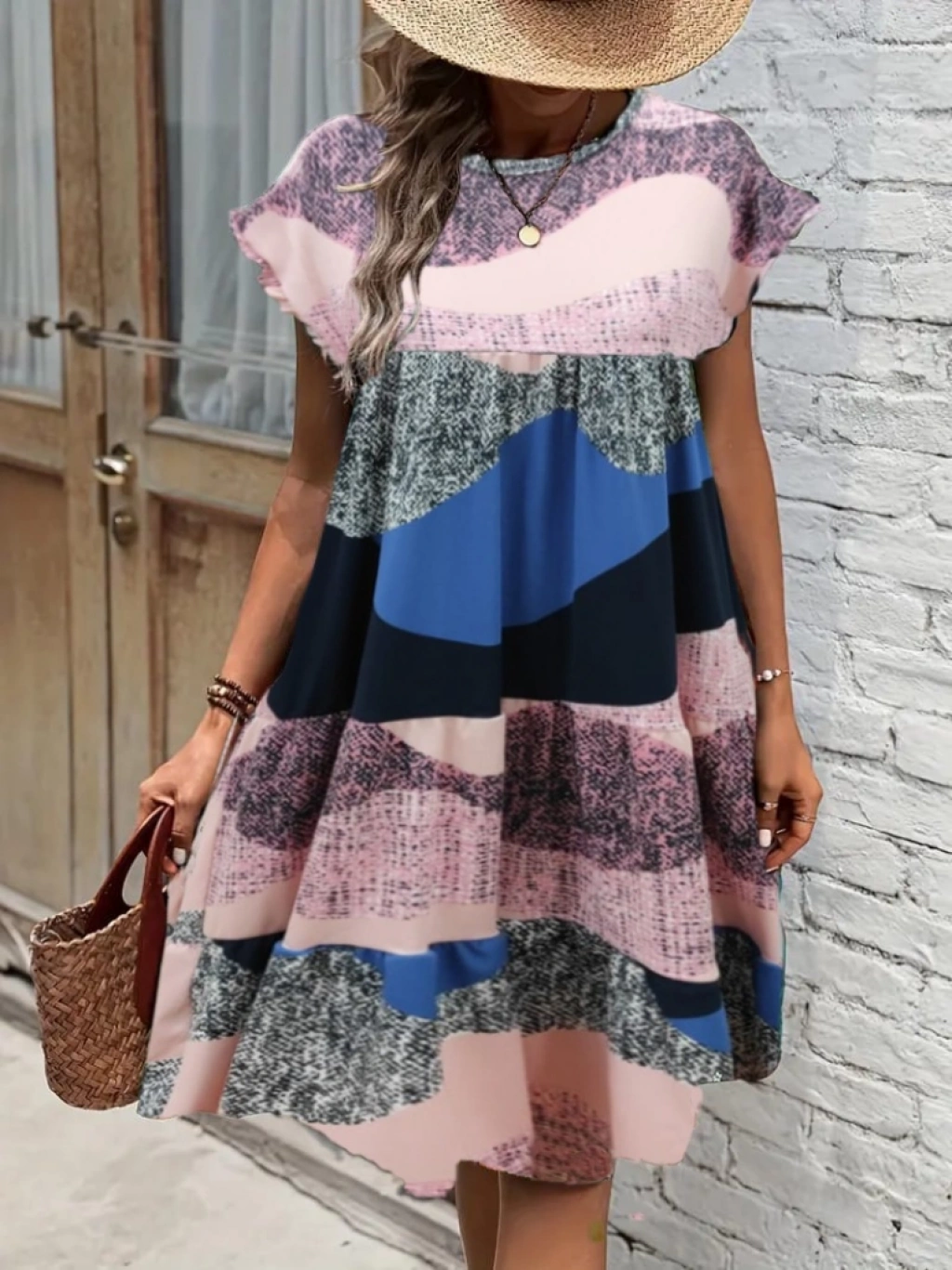 Kadın Kısa Kollu Bisiklet Yaka Kare Desenli Dalgıç Elbise