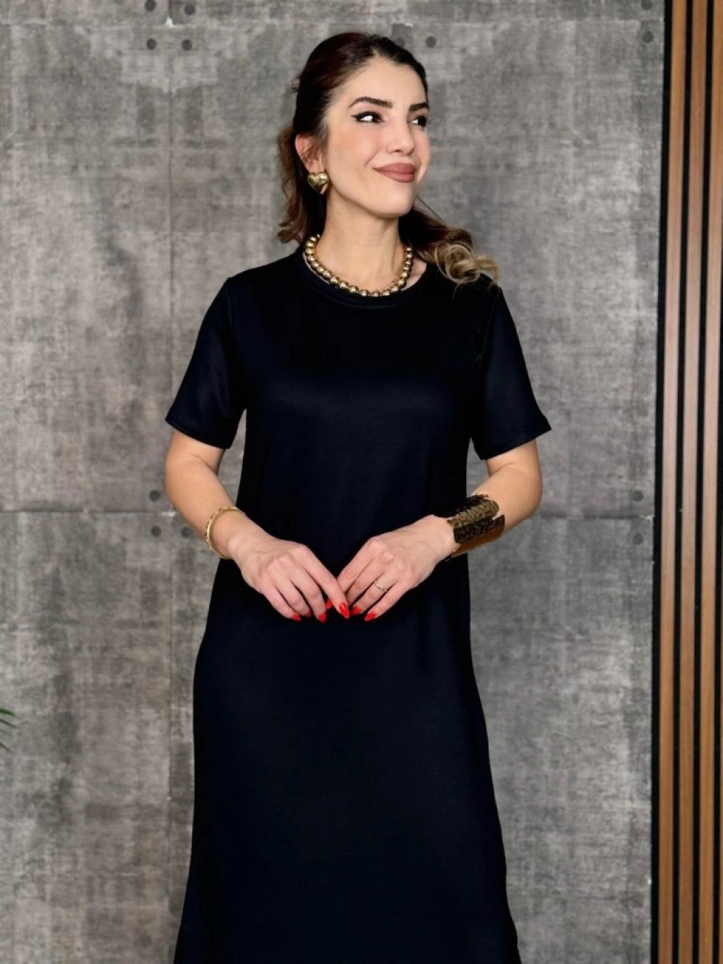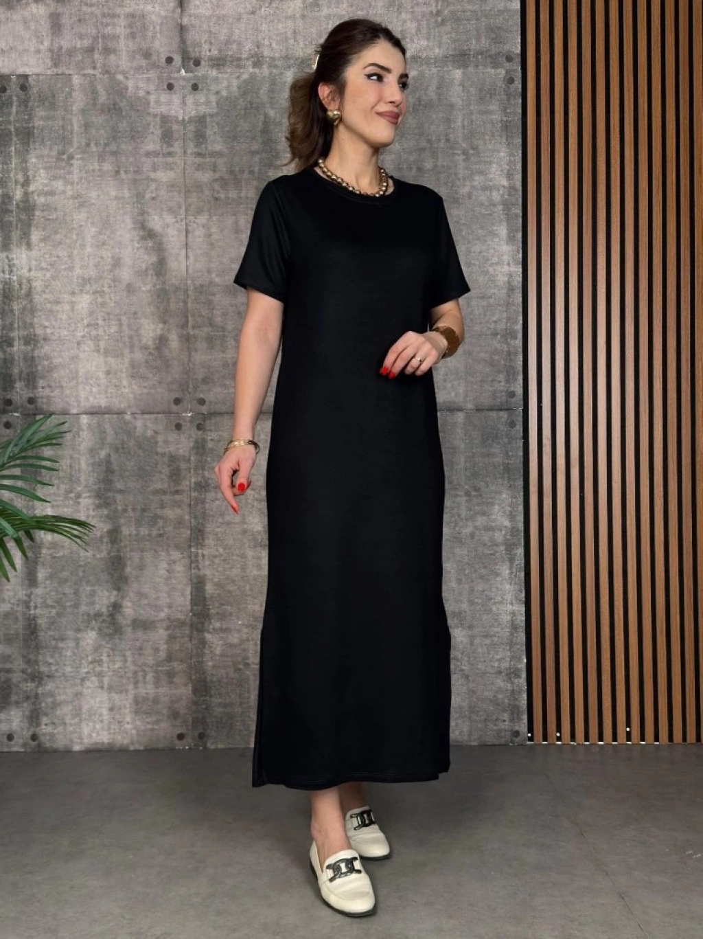 Kadın Kısa Kollu Bisiklet Yaka Yırtmaçlı Viskon Iki Iplik Elbise