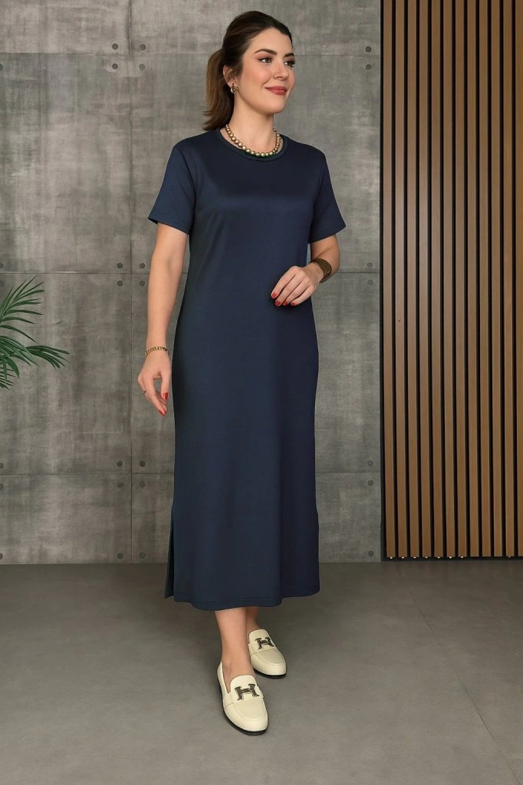 Kadın Kısa Kollu Bisiklet Yaka Yırtmaçlı Viskon Iki Iplik Elbise