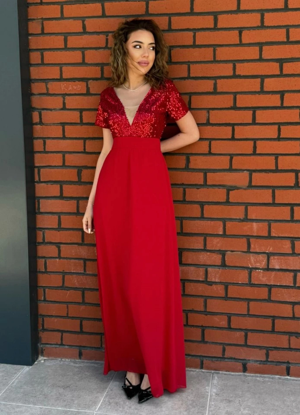 Kadın Kısa Kollu Derin V Yakalı A Kesim Pulpayet Detaylı şifon Nedime Elbisesi