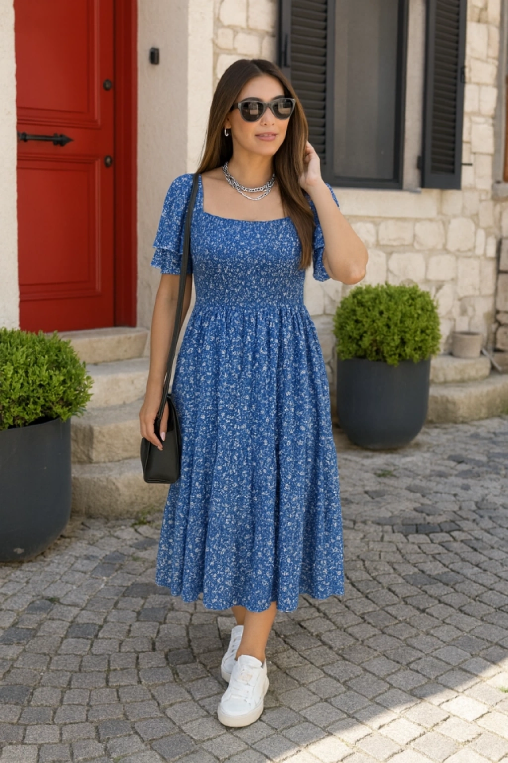 Kadın Kısa Kollu Gipe Detaylı Desenli Midi Süprem Elbise