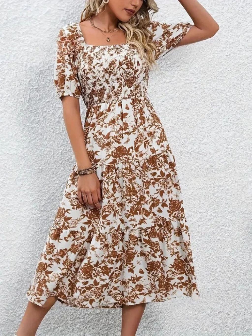 Kadın Kısa Kollu Kare Yakalı Lastikli Desenli Süprem Elbise