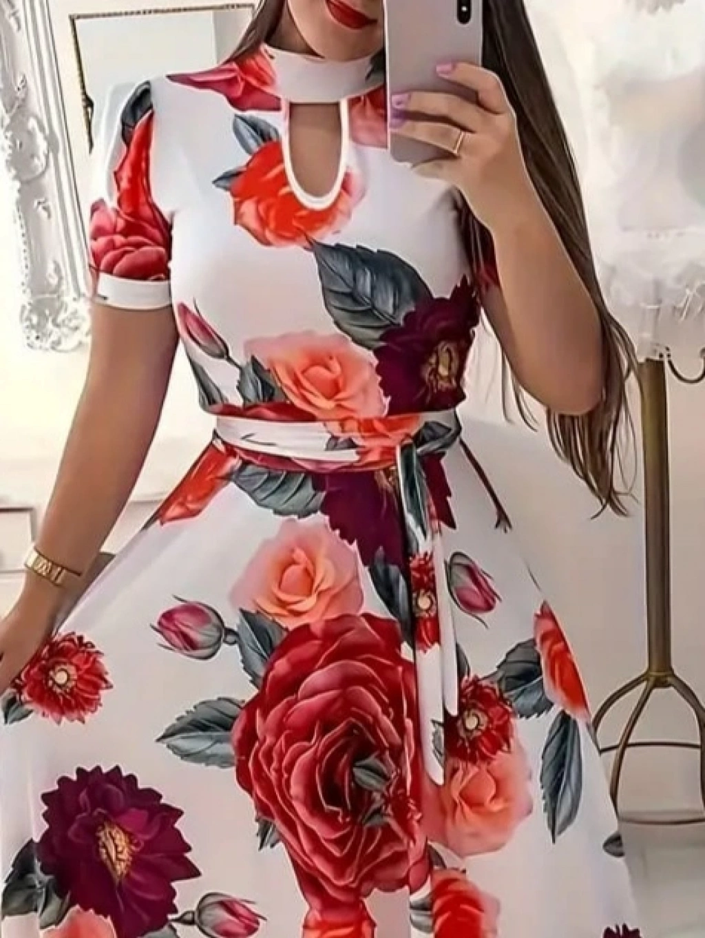 Kadın Kısa Kollu Pencere Detay Gül Baskılı Tam Boy Kiloş Elbise
