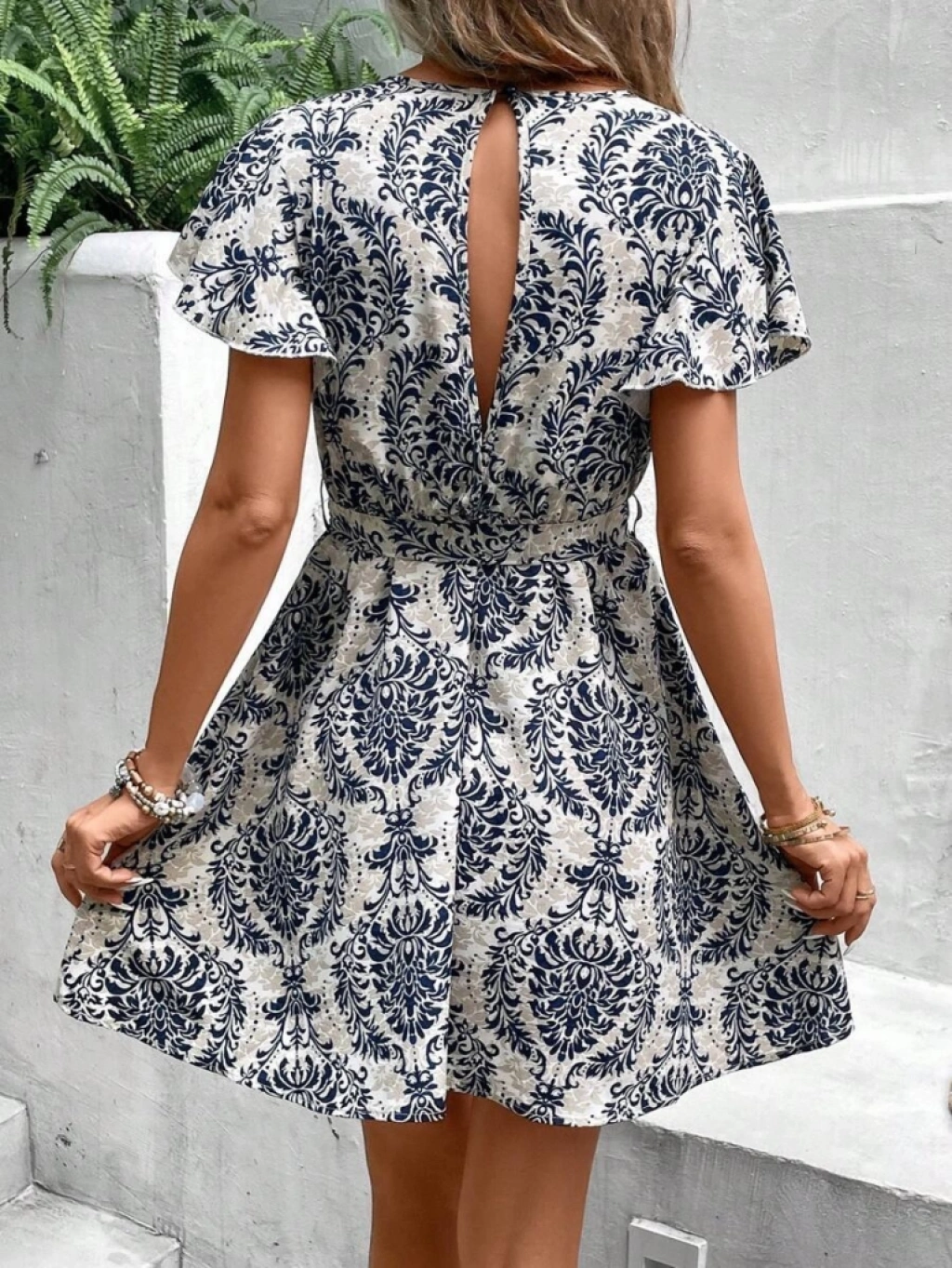 Kadın Kısa Kollu V Yakalı Beli Kuşaklı Desenli Sofya Elbise