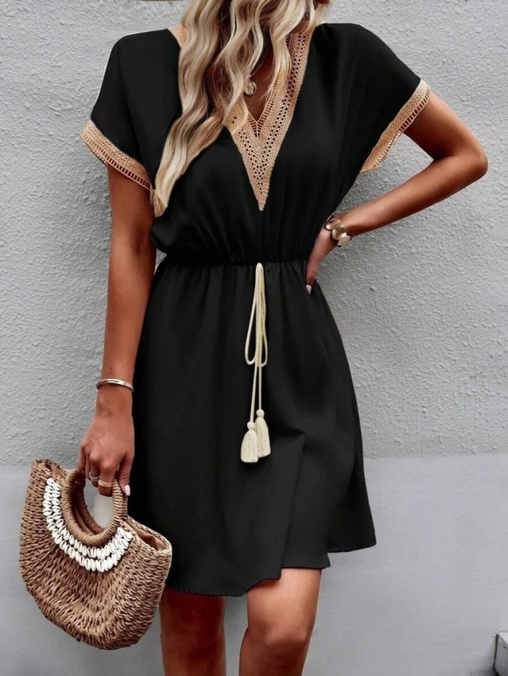Kadın Kısa Kollu V Yakalı Belinde Bağcıklı Viskon Elbise