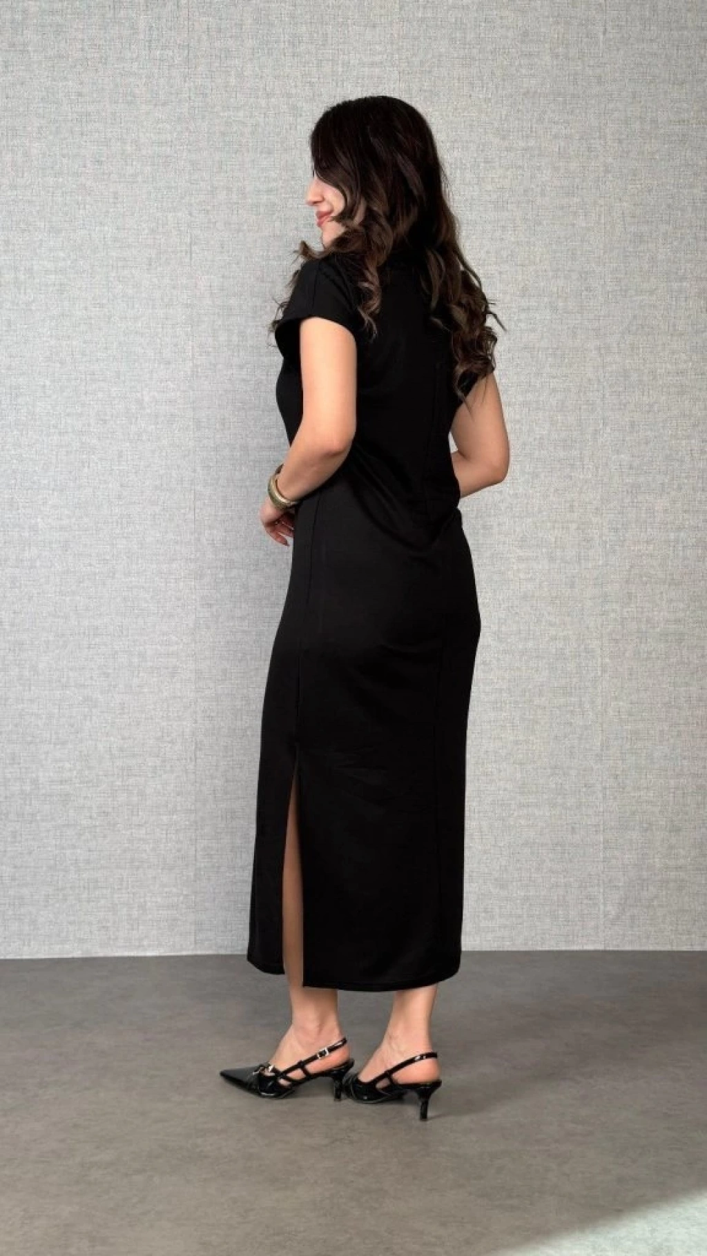 Kadın Kısa Kollu Yakalı Yandan Yırtmaçlı Viskon Iki Iplik Elbise