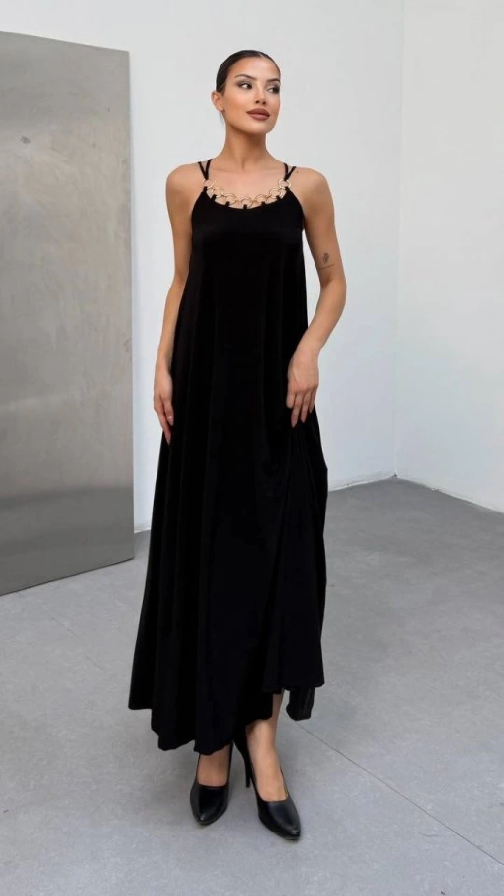 Kadın Omuz Askılı Kuş Gözü Zincir Detay Sandy Kumaş Maxi Boy Elbise