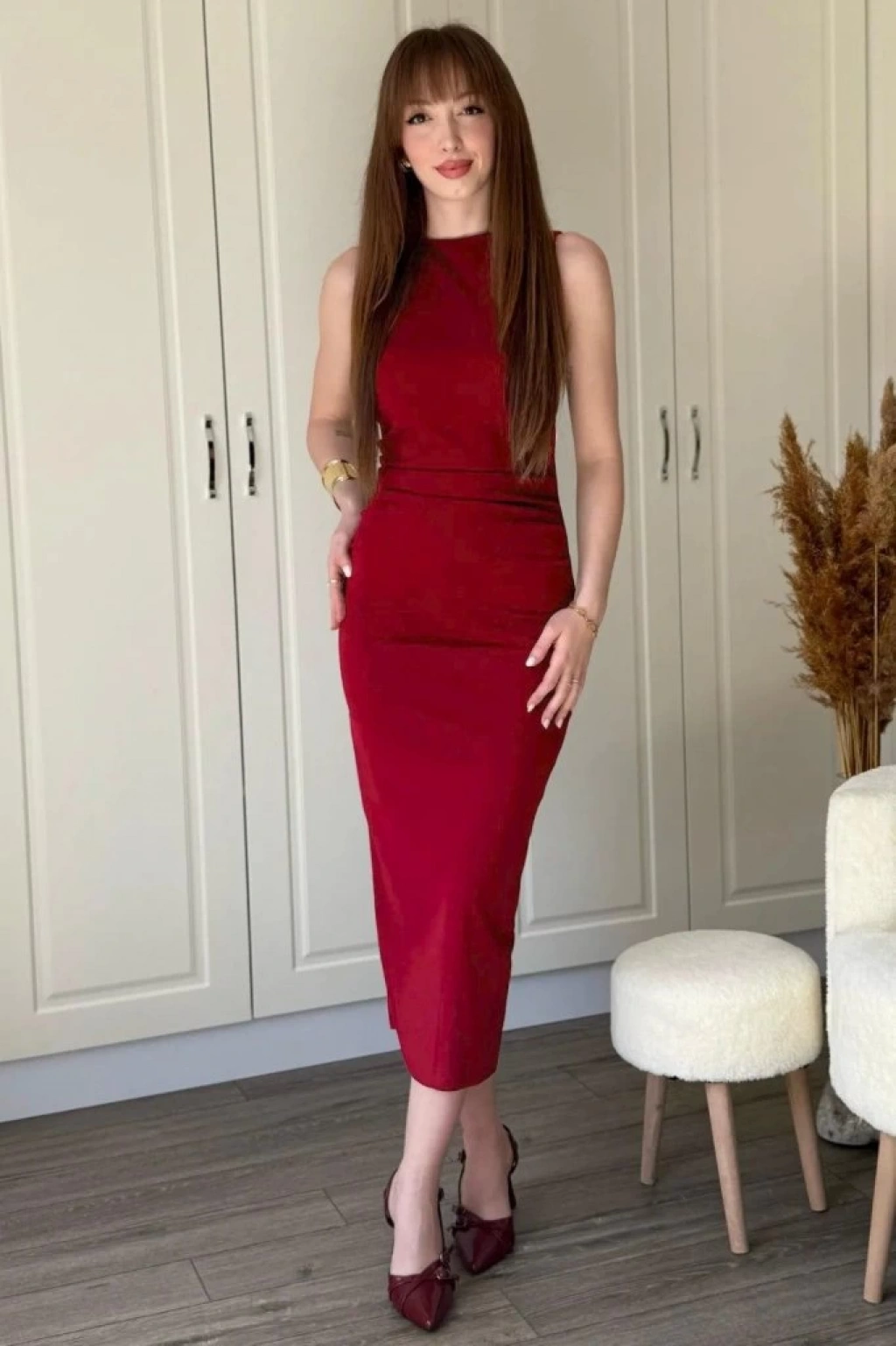 Kadın Sıfır Kol Sıfır Yaka Drape Detaylı Midi Janjan Krep Elbise