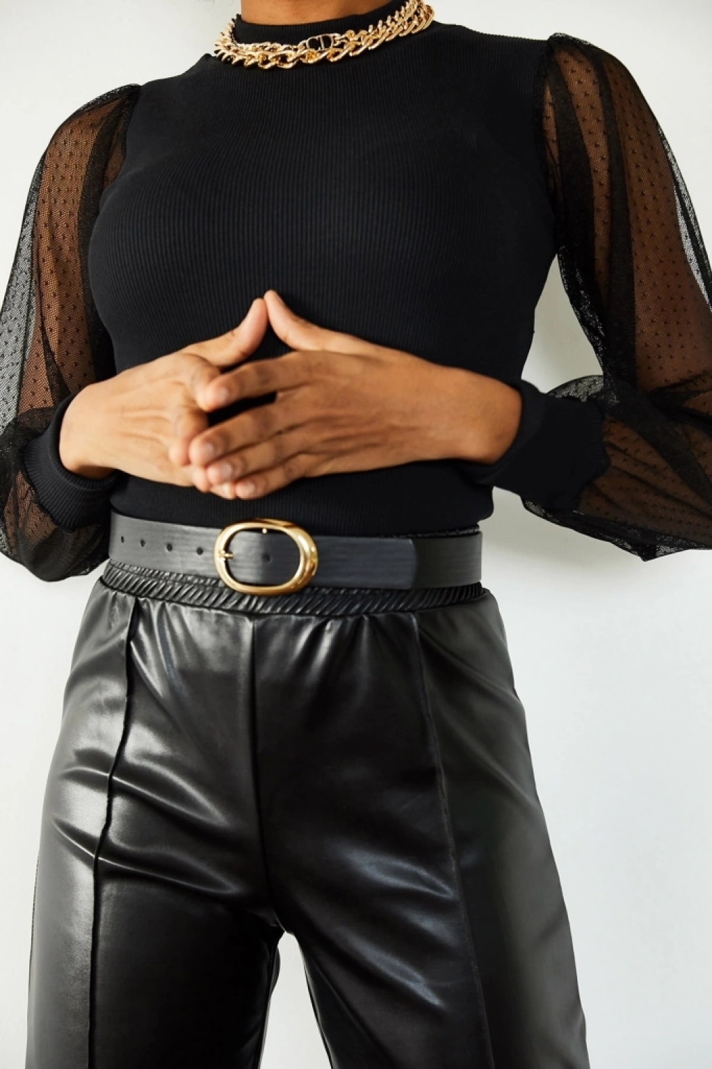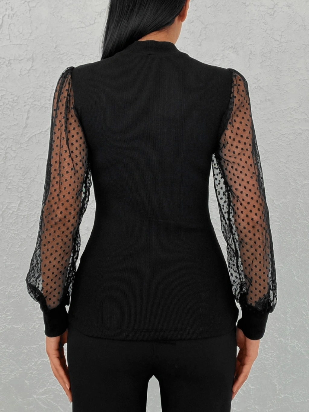 Kadın Siyah Kolu Tül Detaylı Yarım Balıkçı Kaşkorse Bluz