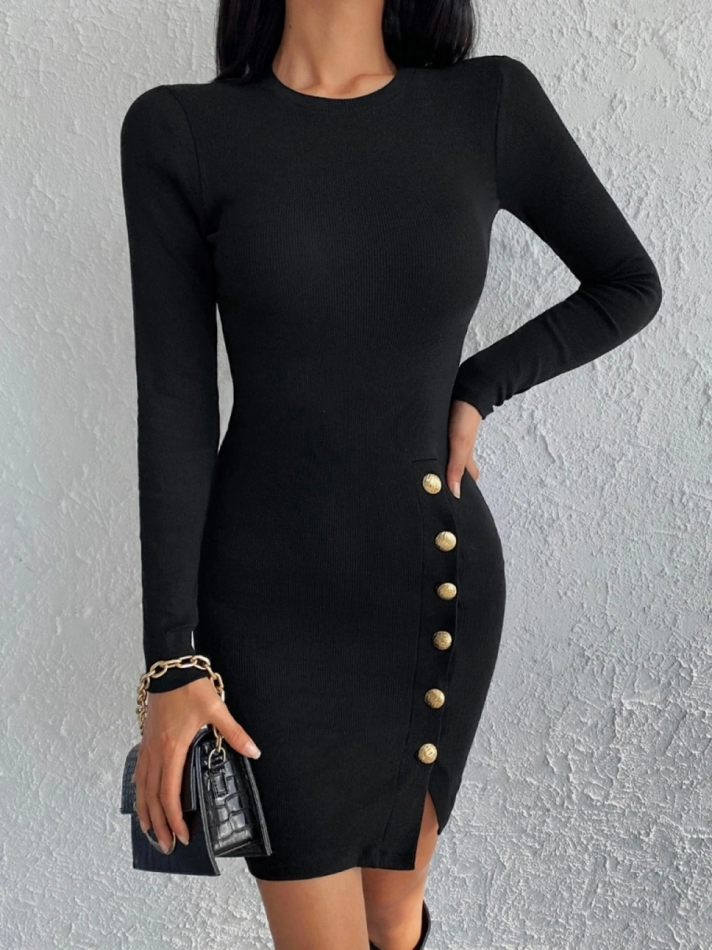 Kadın Siyah Uzun Kollu Bisiklet Yaka Yan Yırtmaç Düğme Detay Kısa Kaşkorse Elbise